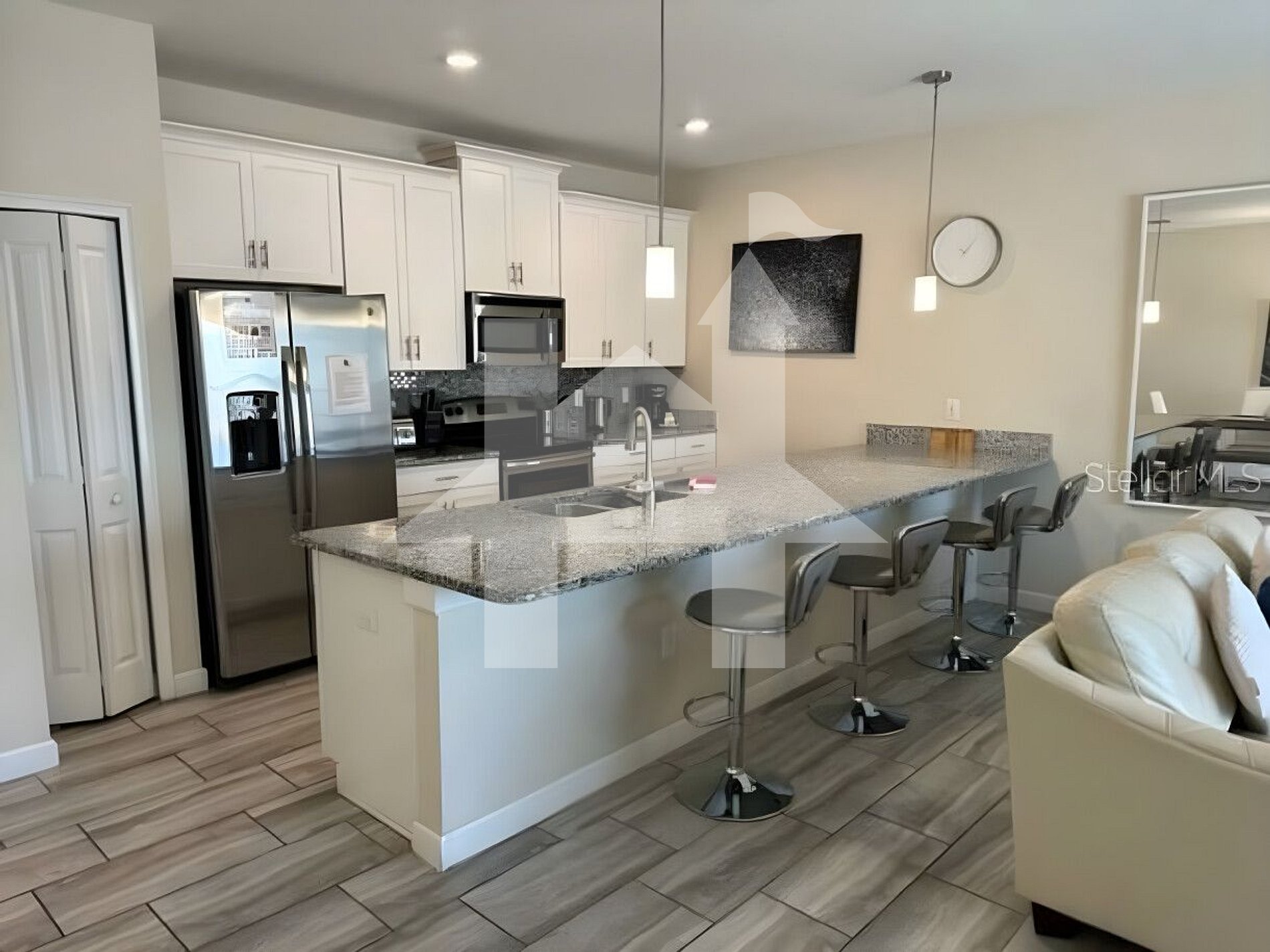 The open-concept living room seamlessly connects to the fully equipped kitchen and dining area, creating the perfect space to gather, watch TV, or enjoy family meals together.
