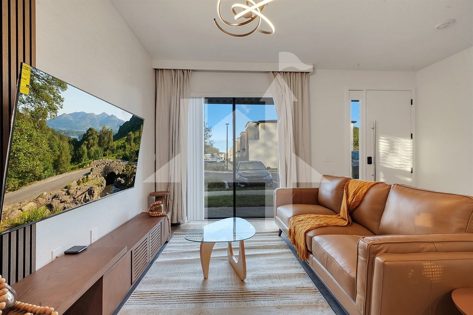 Spacious living room with 4-seat sofa, chair, and 55" Smart TV