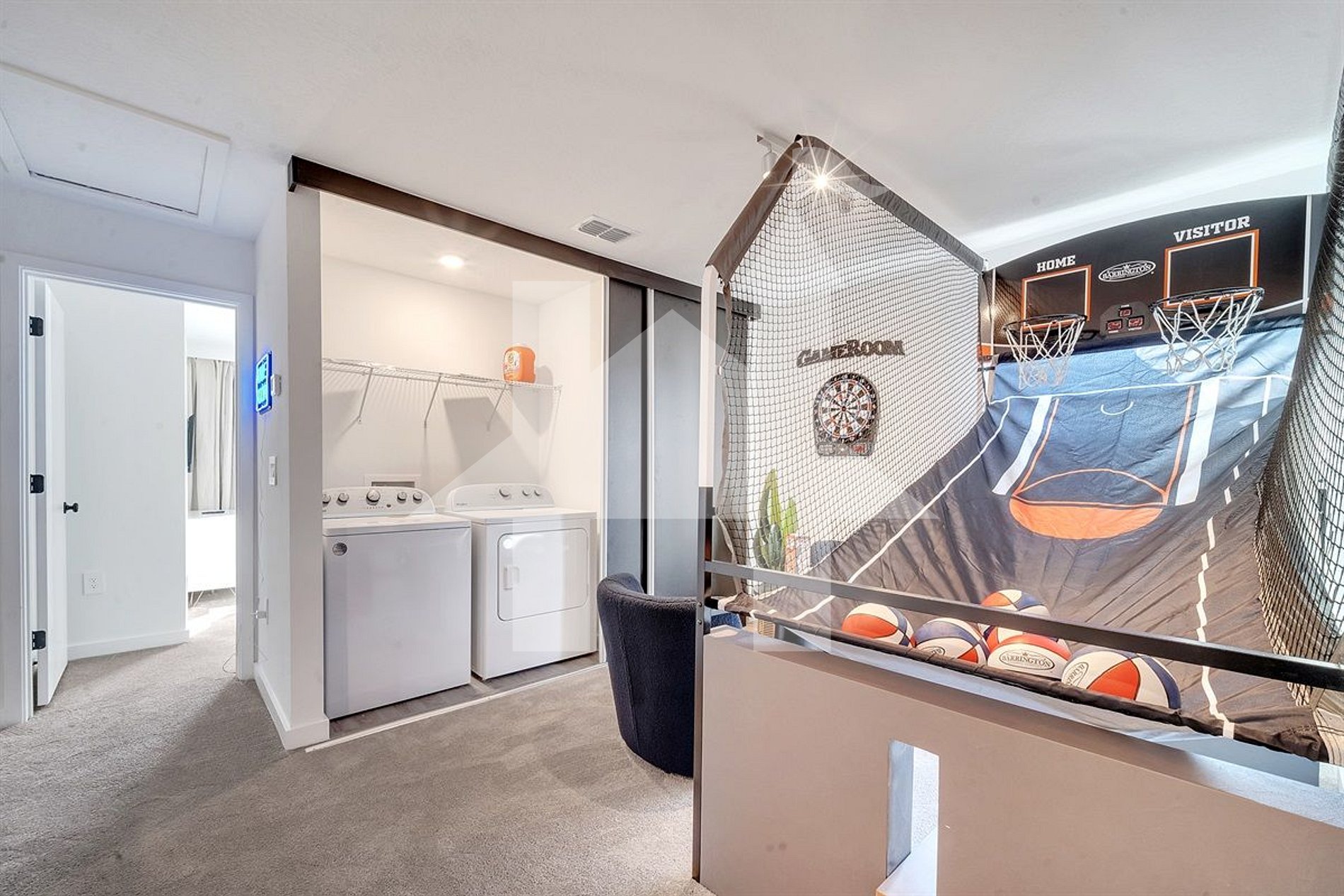Loft with basketball arcade game for fun moments