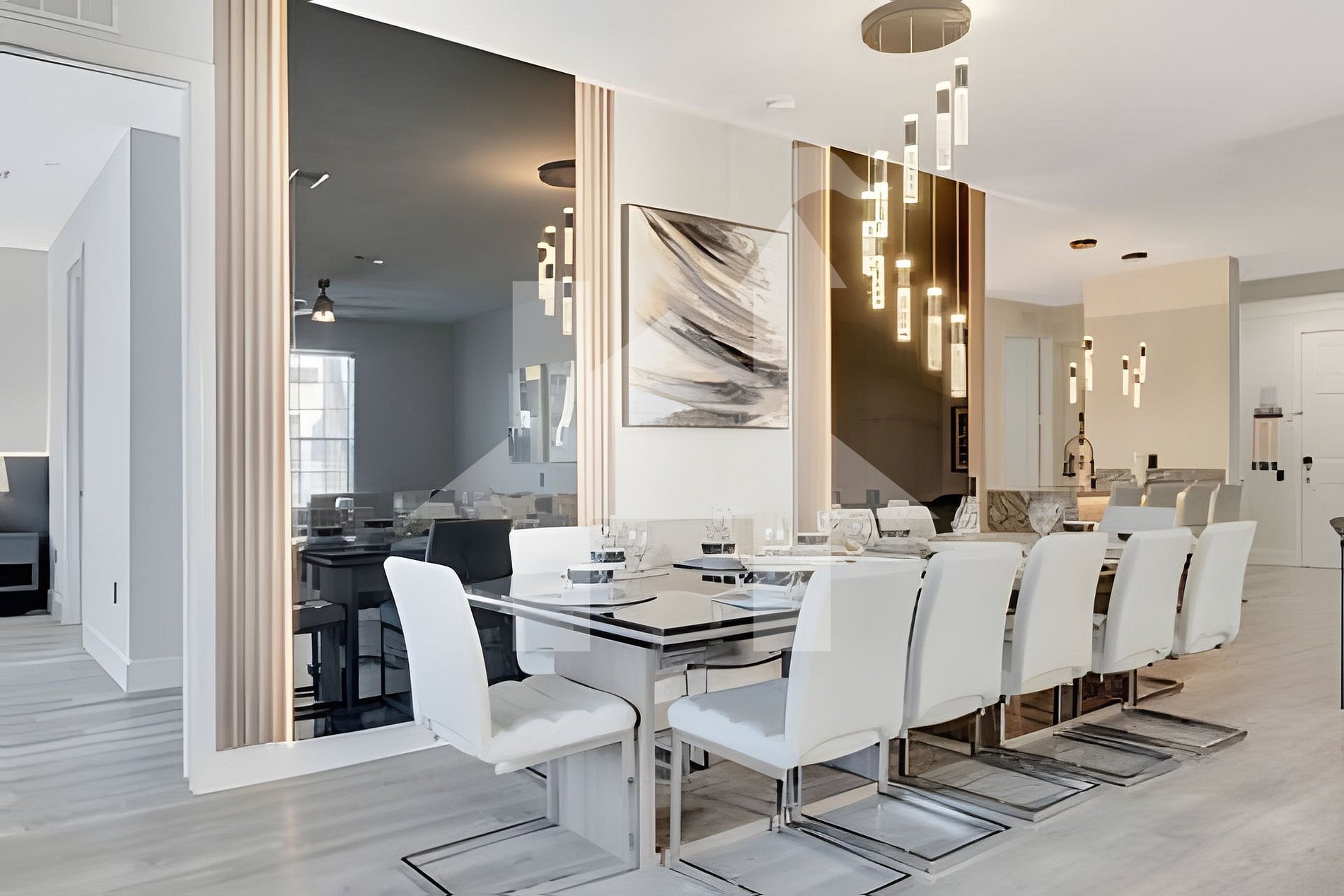 Open-concept living room with a large sectional sofa for 8, Smart TV, and screened balcony. Elegant dining area seats 12, plus 4 stools at the breakfast bar. Fully equipped kitchen with modern appliances and utensils for any meal.