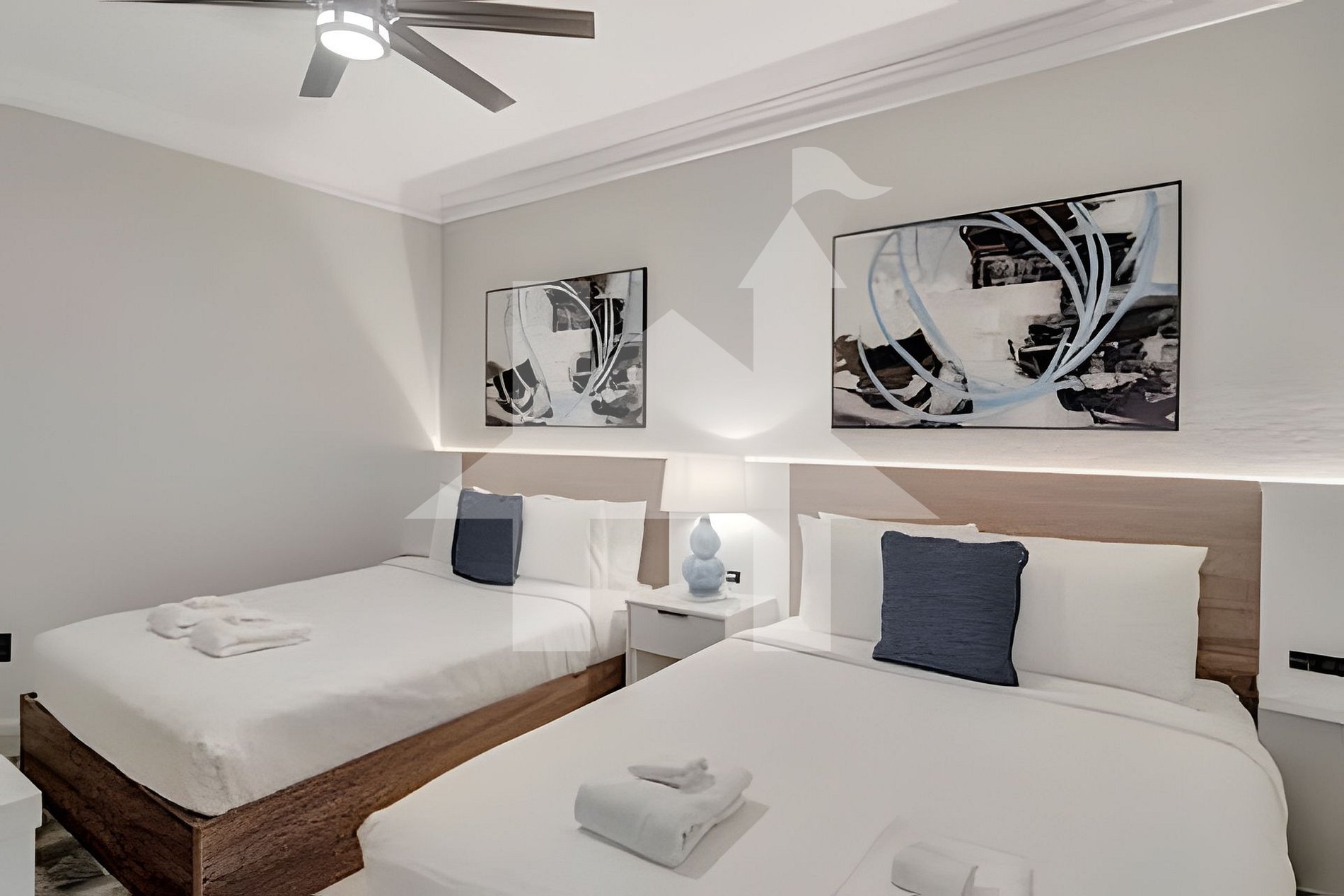 Queen Bedroom: 2 Queen beds, Smart TV, shared bathroom.