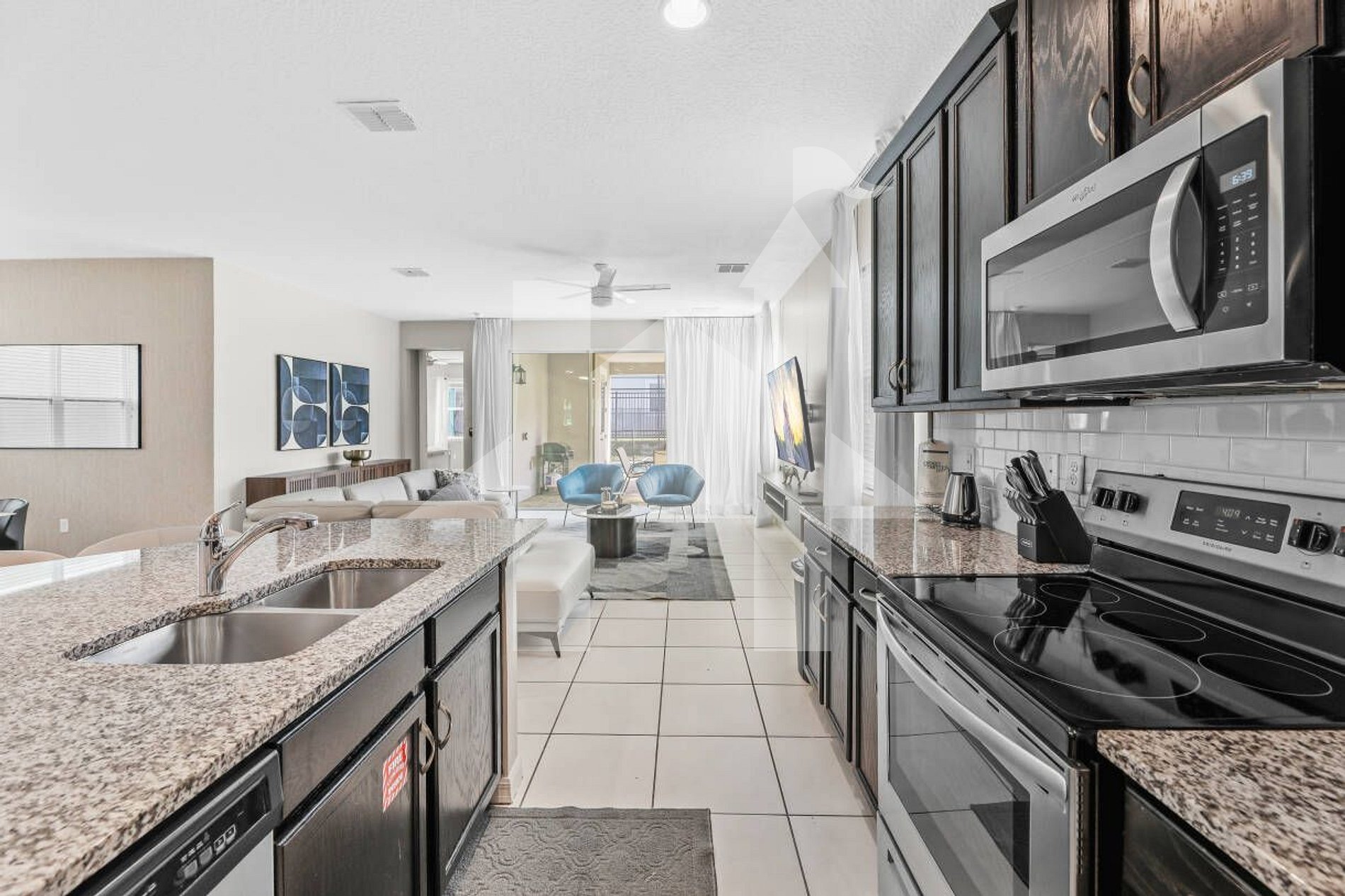 The first floor features a beautifully designed open-concept living area with a fully equipped modern kitchen, a large dining table, and a cozy living room with a Smart TV — perfect for relaxing after a day at the parks. Sliding glass doors lead to the private screened pool area, ideal for sunbathing or enjoying a refreshing swim.