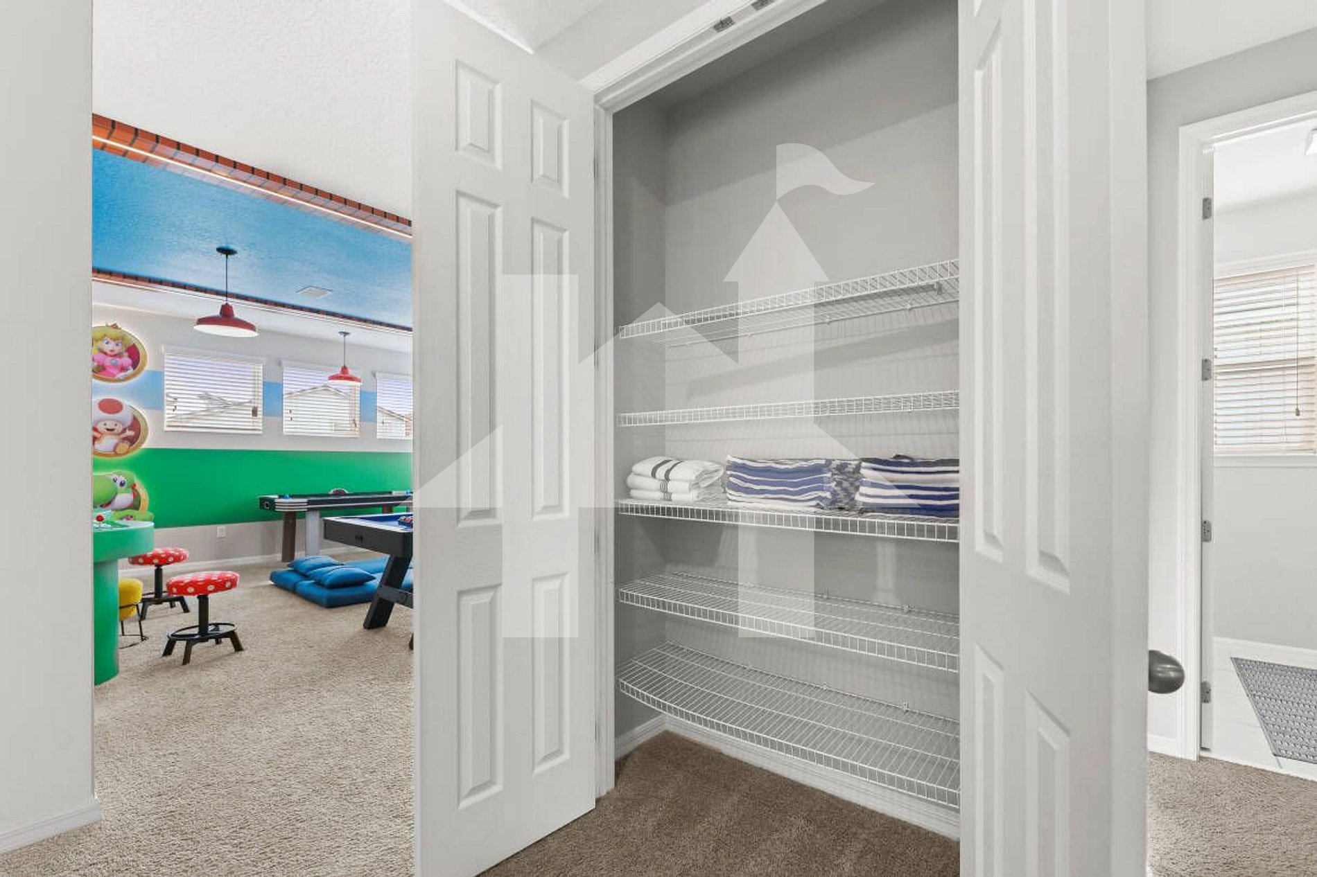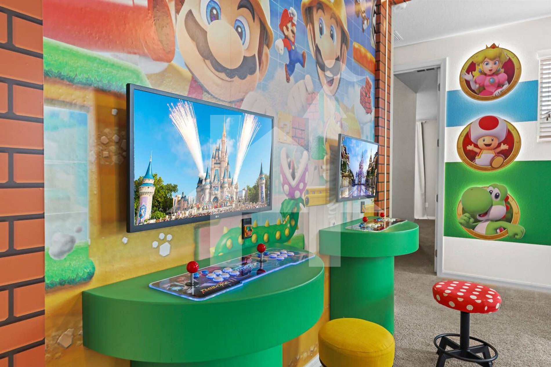Upstairs, the fun continues. A spacious game loft with comfortable seating offers entertainment for guests of all ages.