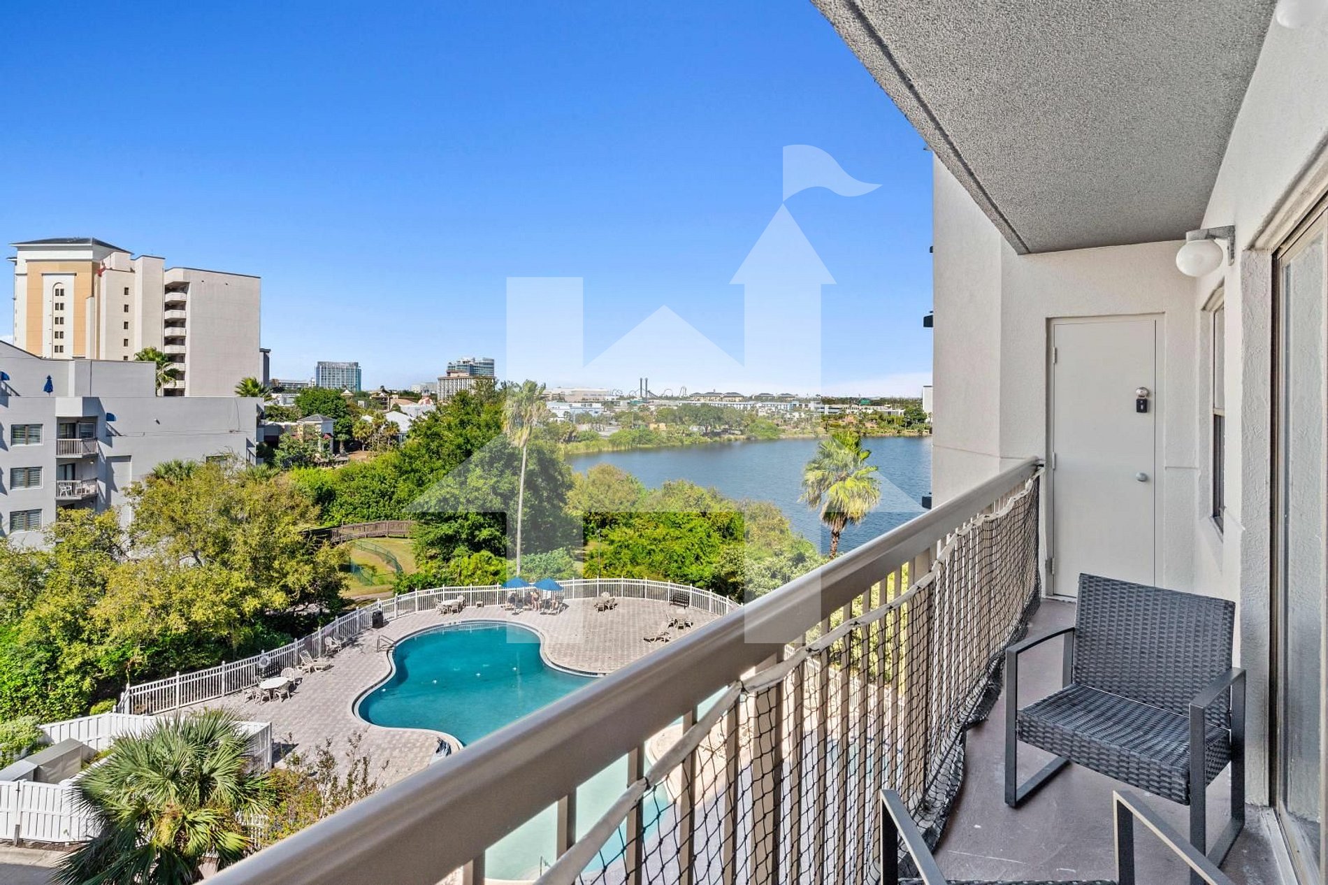 Living Area: open-concept space with a fully equipped kitchen (granite countertops and stainless-steel appliances), a cozy sofa bed for 2 extra guests, and a private balcony overlooking the pool and lake.