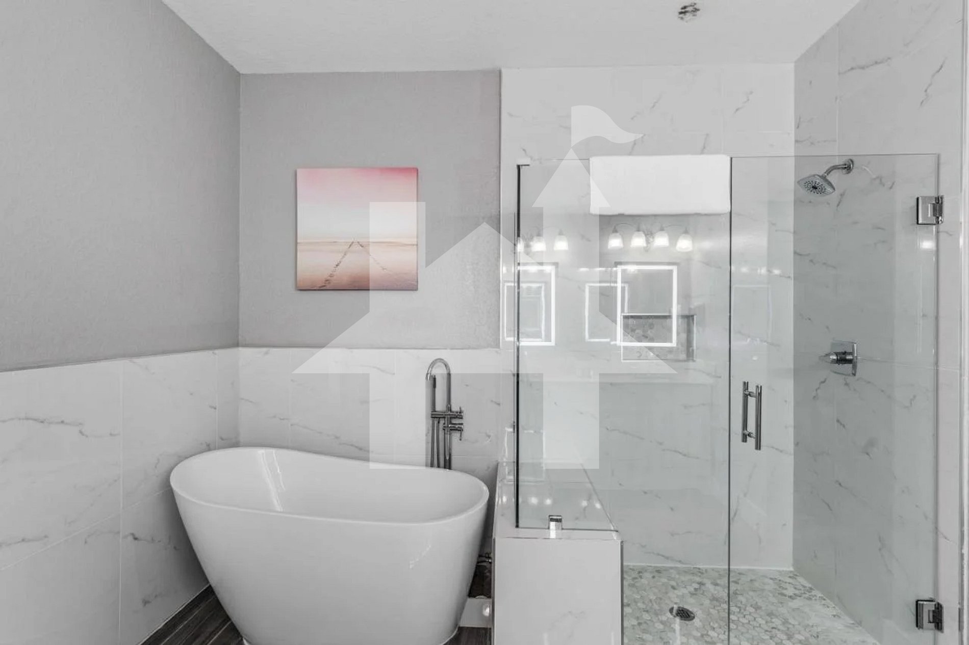 Primary Suite: King bed, private bathroom with walk-in shower and soaking tub.