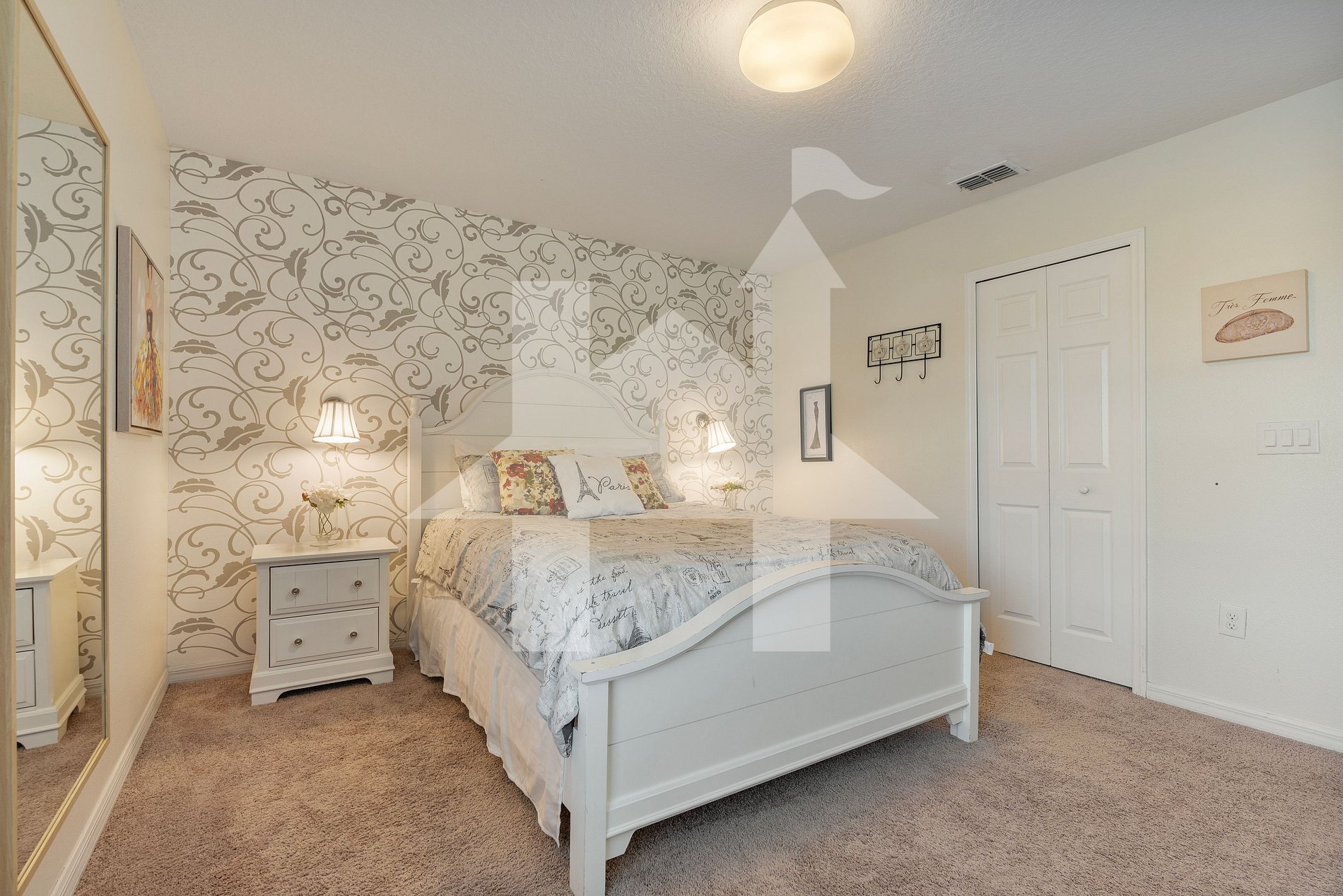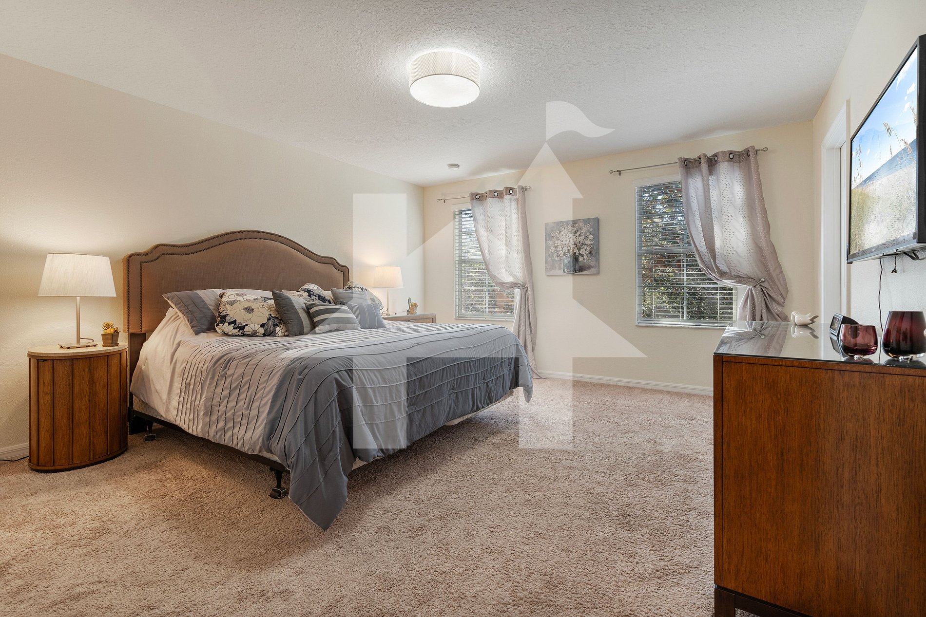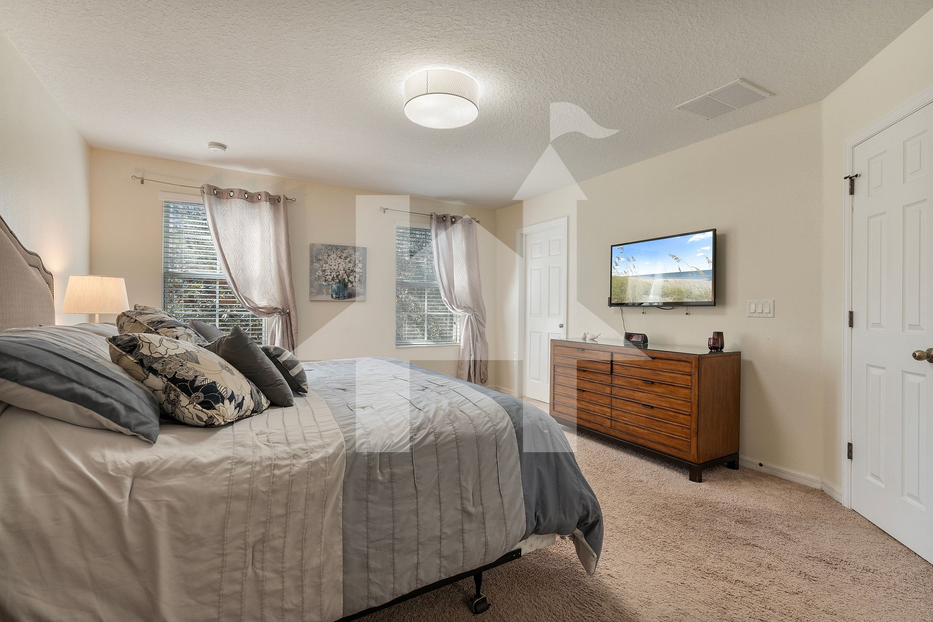 - Master Suite: King bed, TV, closet, and private bath.