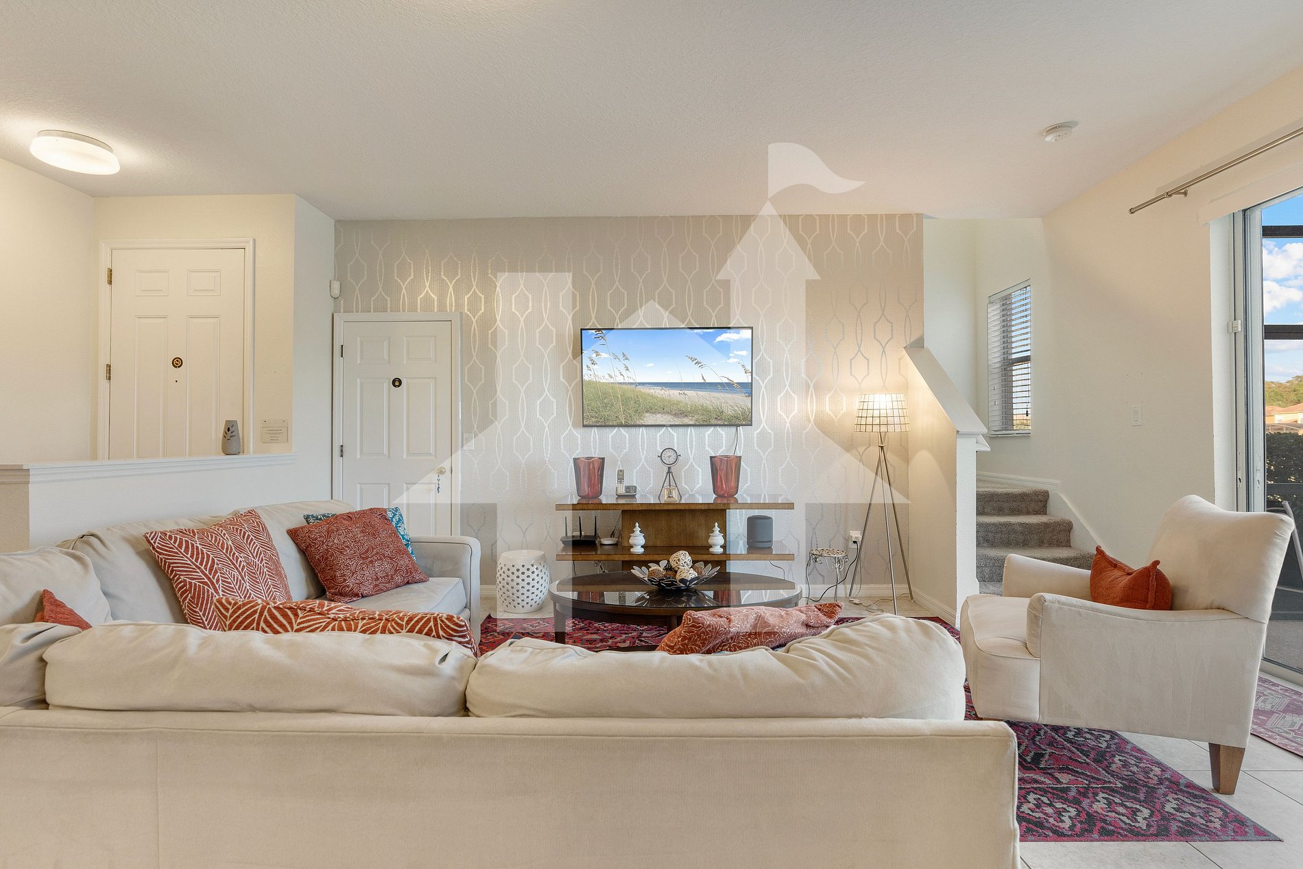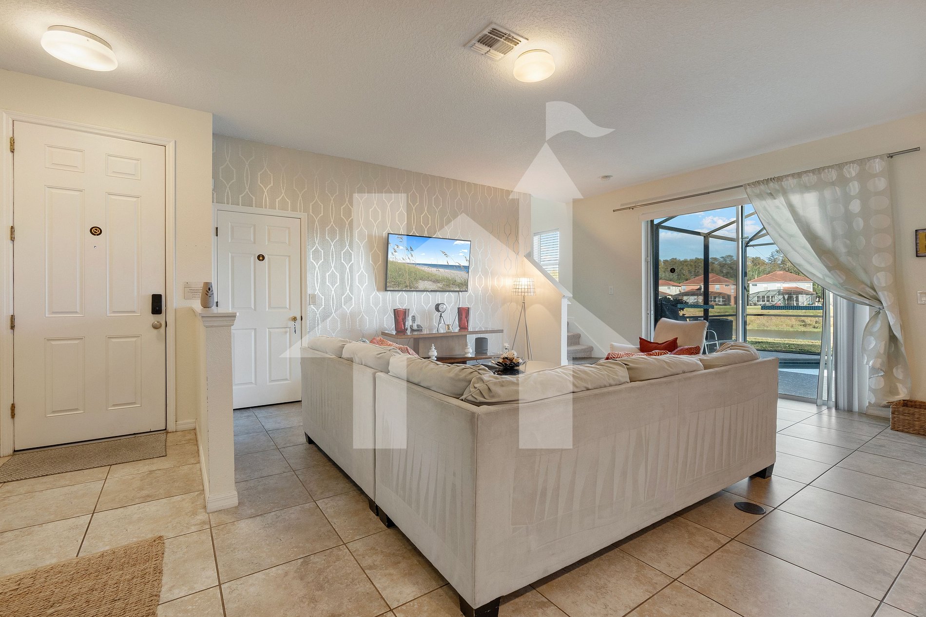 Spacious living room with 55” Smart TV, comfortable seating, and access to the screened lanai and private pool area.
