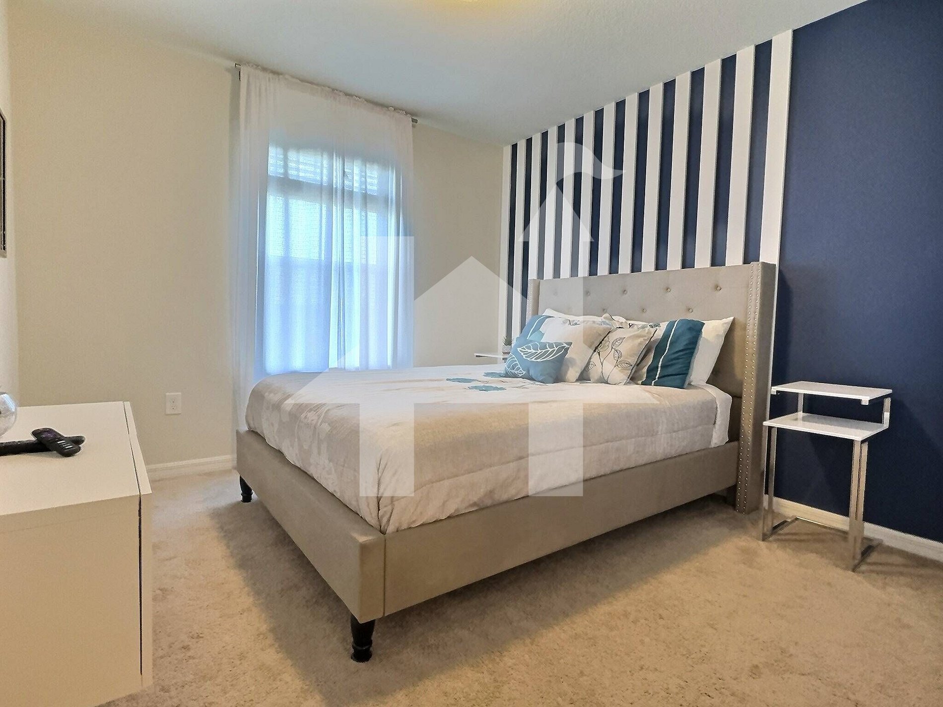 • Queen Bedroom: Queen bed, Smart TV, shared full bathroom