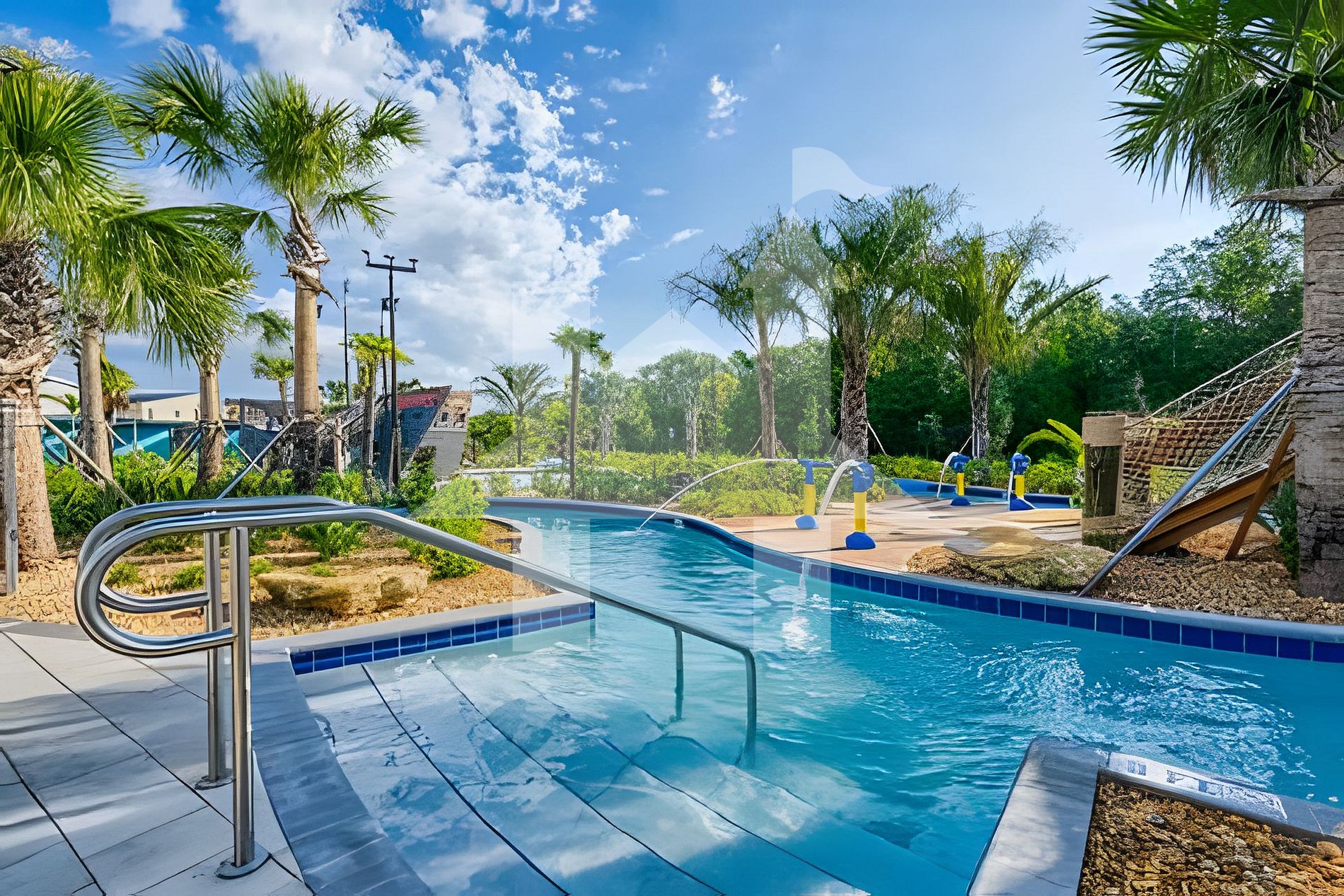 Storey Lake Resort offers a full lineup of family-friendly features: resort-style pool with slides, lazy river, tiki bar, fitness center, sports courts, kayaking, mini-golf, and a pirate-themed kids' splash pad all within walking distance.
