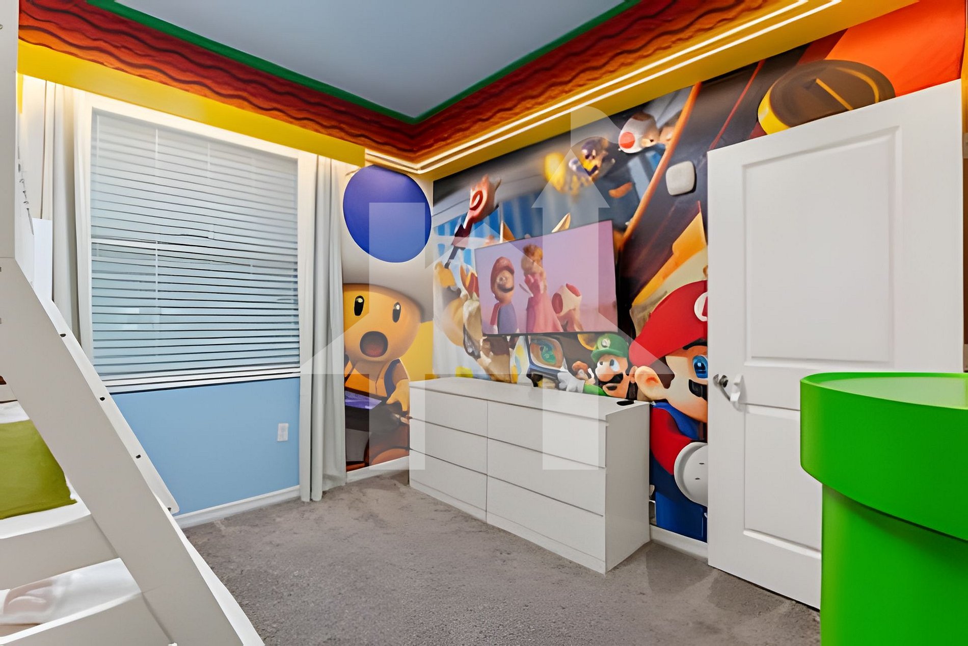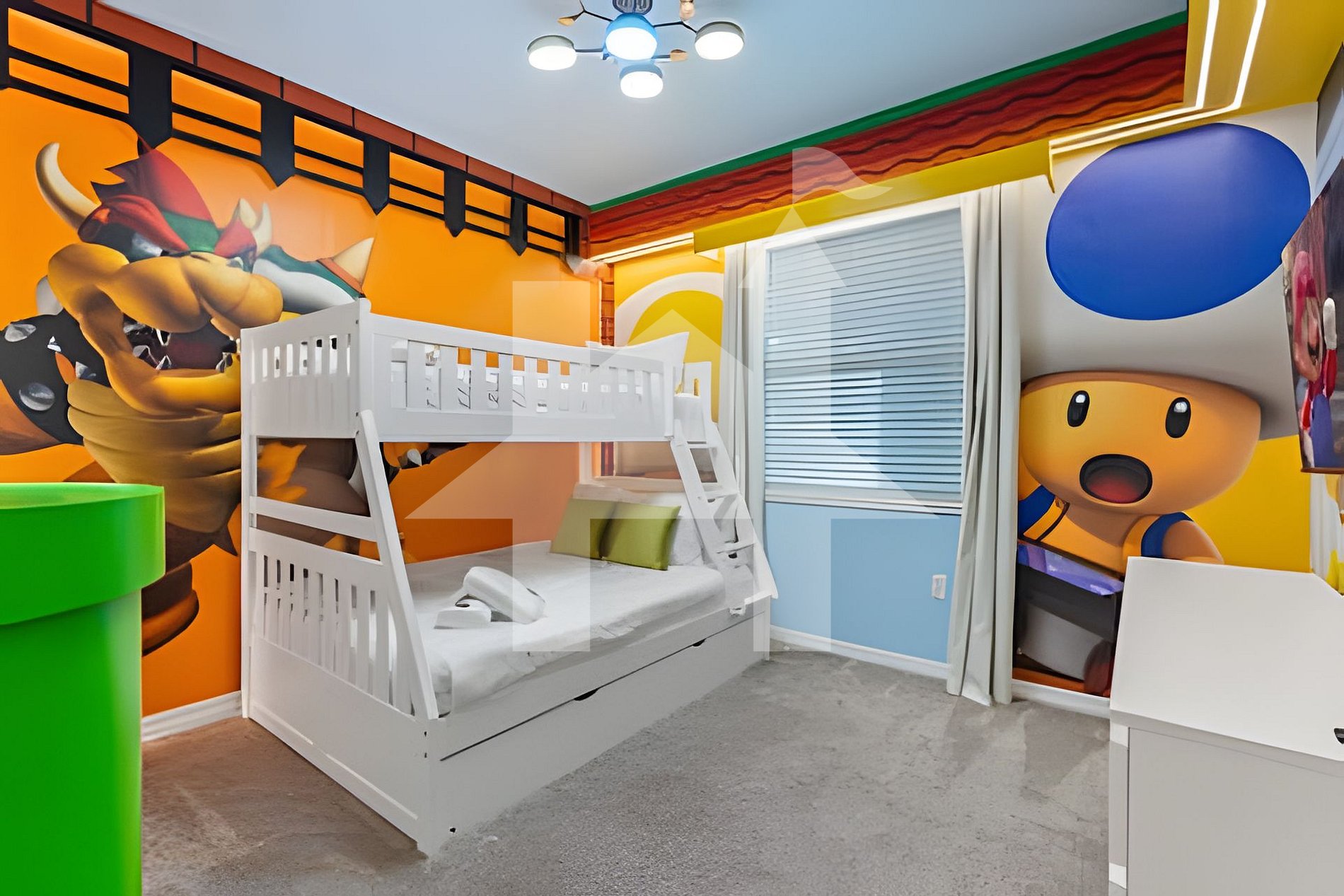 -Mario Bros-Themed Bedroom: 1 bunk bed (1 Full + 2 Twin beds), shared bathroom with living area