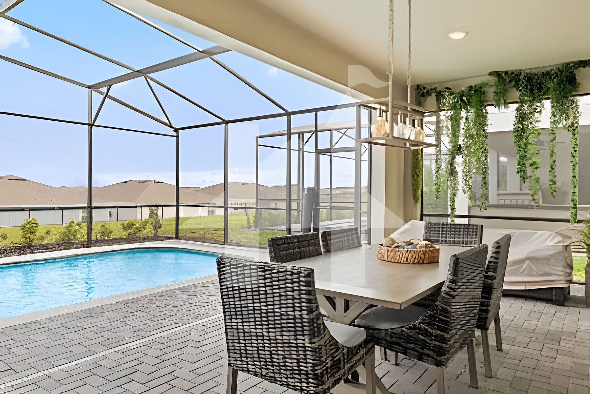 - Covered lanai with outdoor dining area and loungers