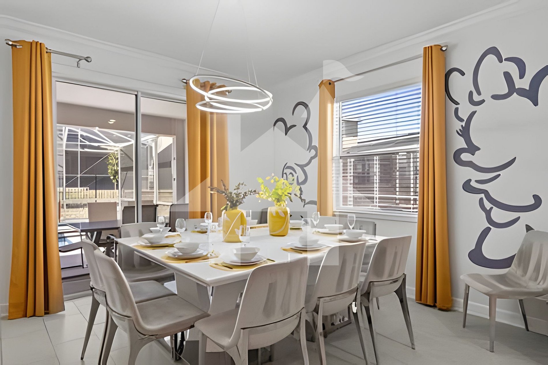 Each room is inspired by beloved stories, with décor that delights guests of all ages from the Lion King and Encanto to Star Wars, Mickey Mouse, and a grand Magic Kingdom Castle. The open-concept layout includes a stylish living room, a fully equipped kitchen, and a dining area perfect for large family meals.