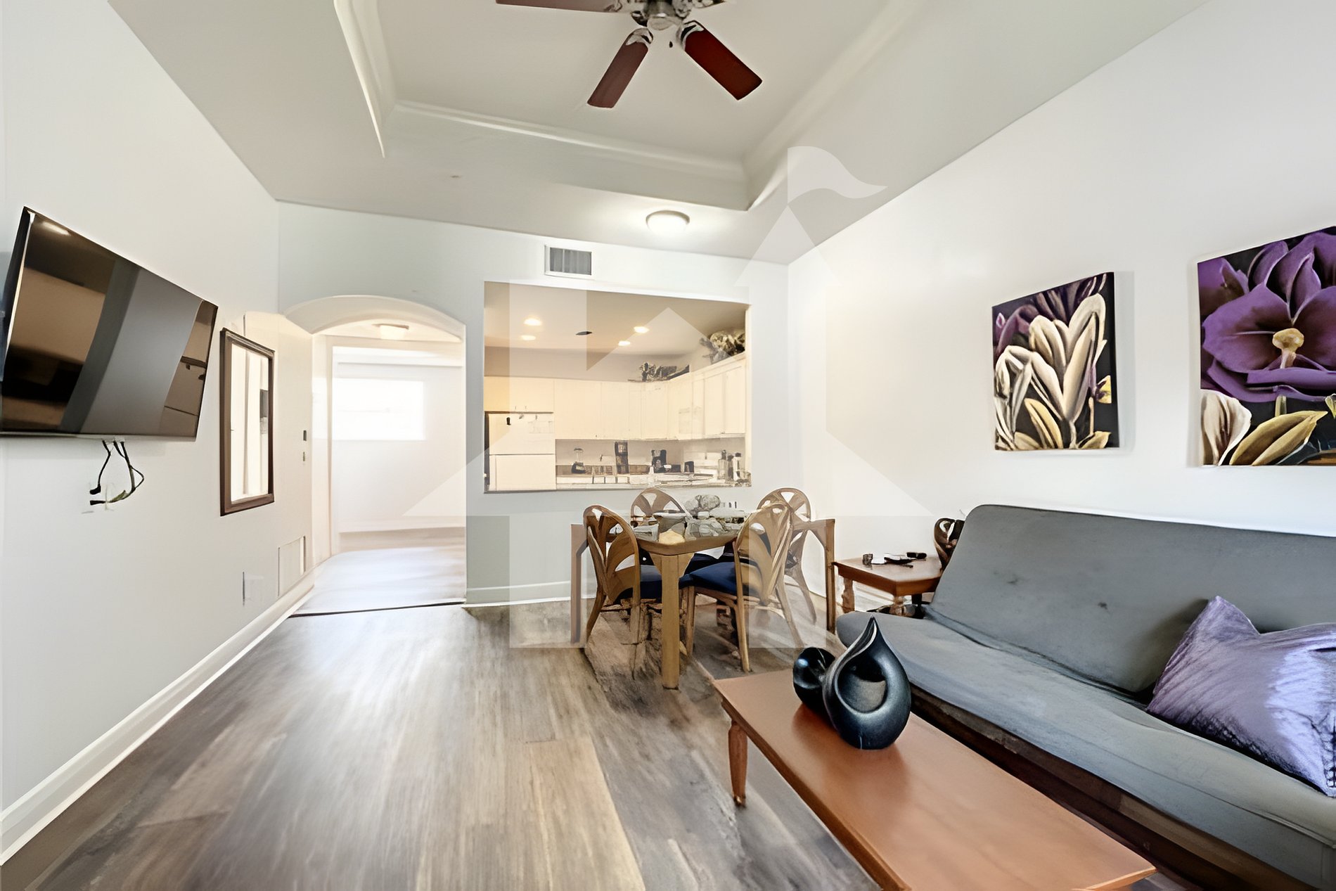 - Open-concept great room with dining area and smart TV