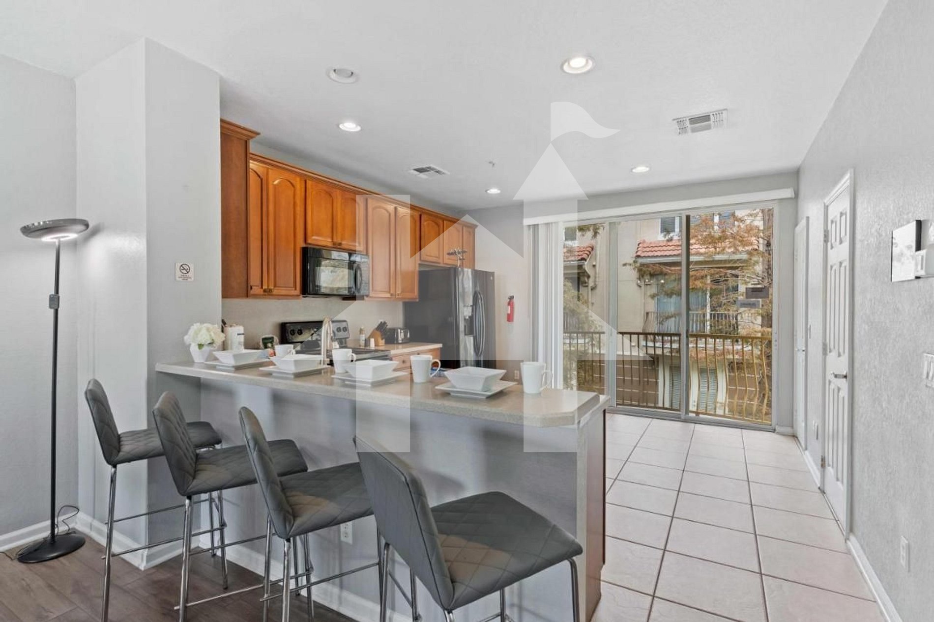 The fully equipped kitchen comes with stainless steel appliances, bright countertops, and all the essentials for preparing meals or snacks. The dining area comfortably seats six, ideal for family dinners or casual breakfasts before heading out.