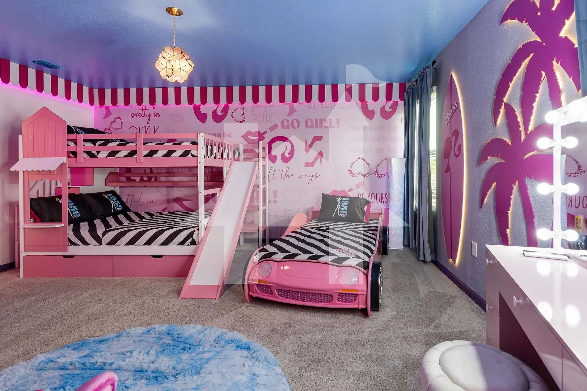 • Bedroom 3: Barbie room (bunk: 2 fulls + 1 twin) + ensuite