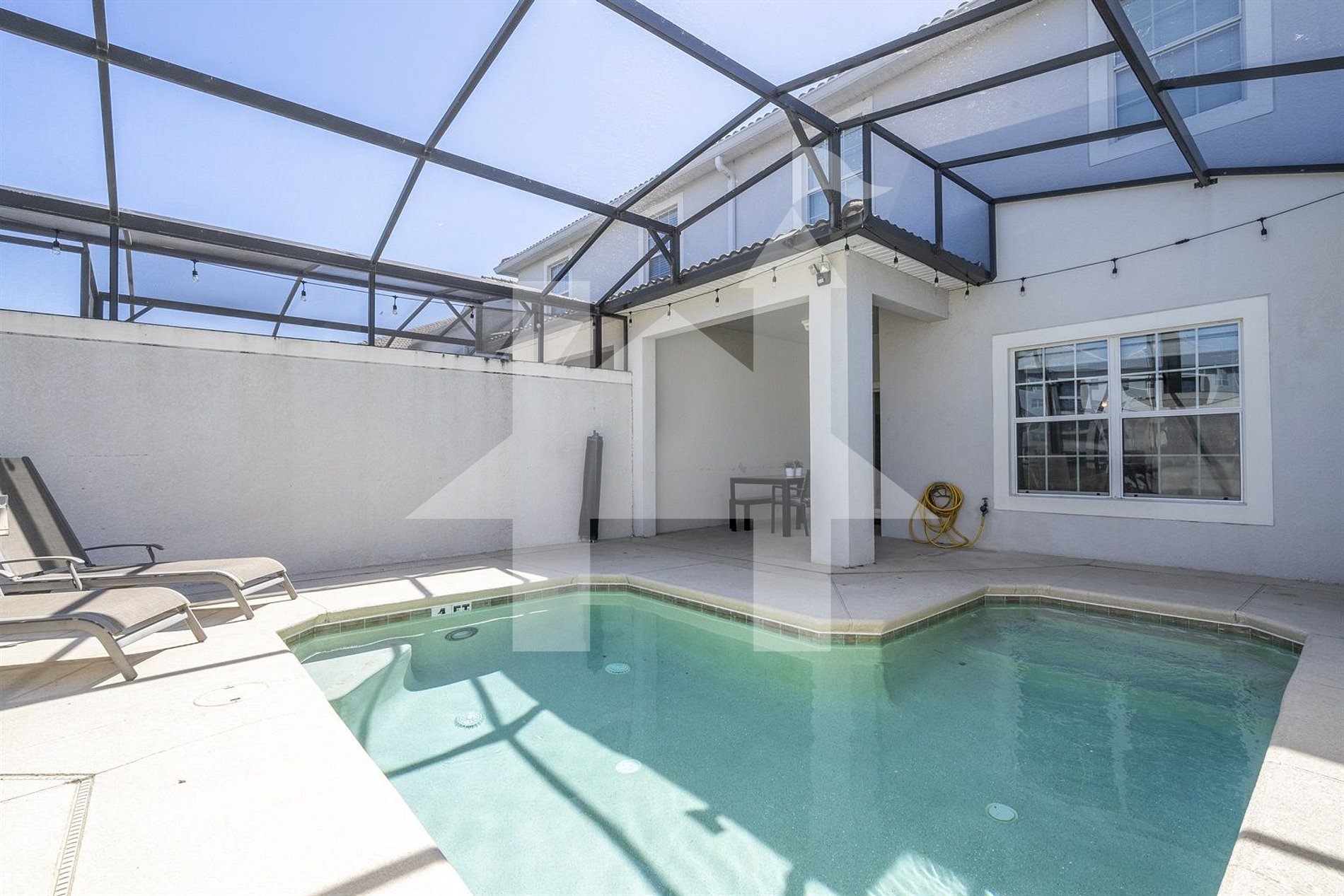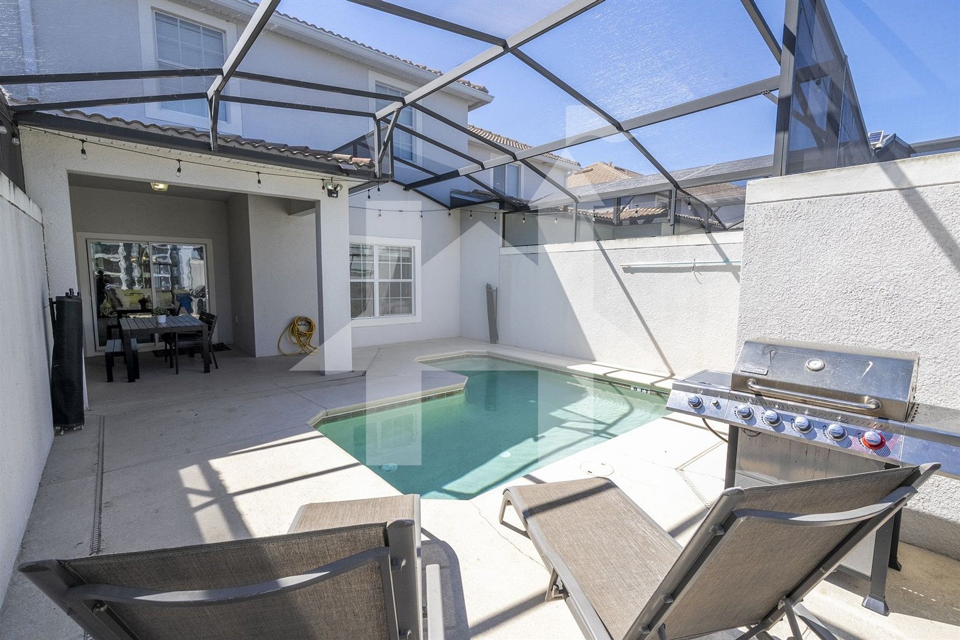 • Enjoy a screened lanai with private splash pool, loungers, dining table, and child-safety fence.