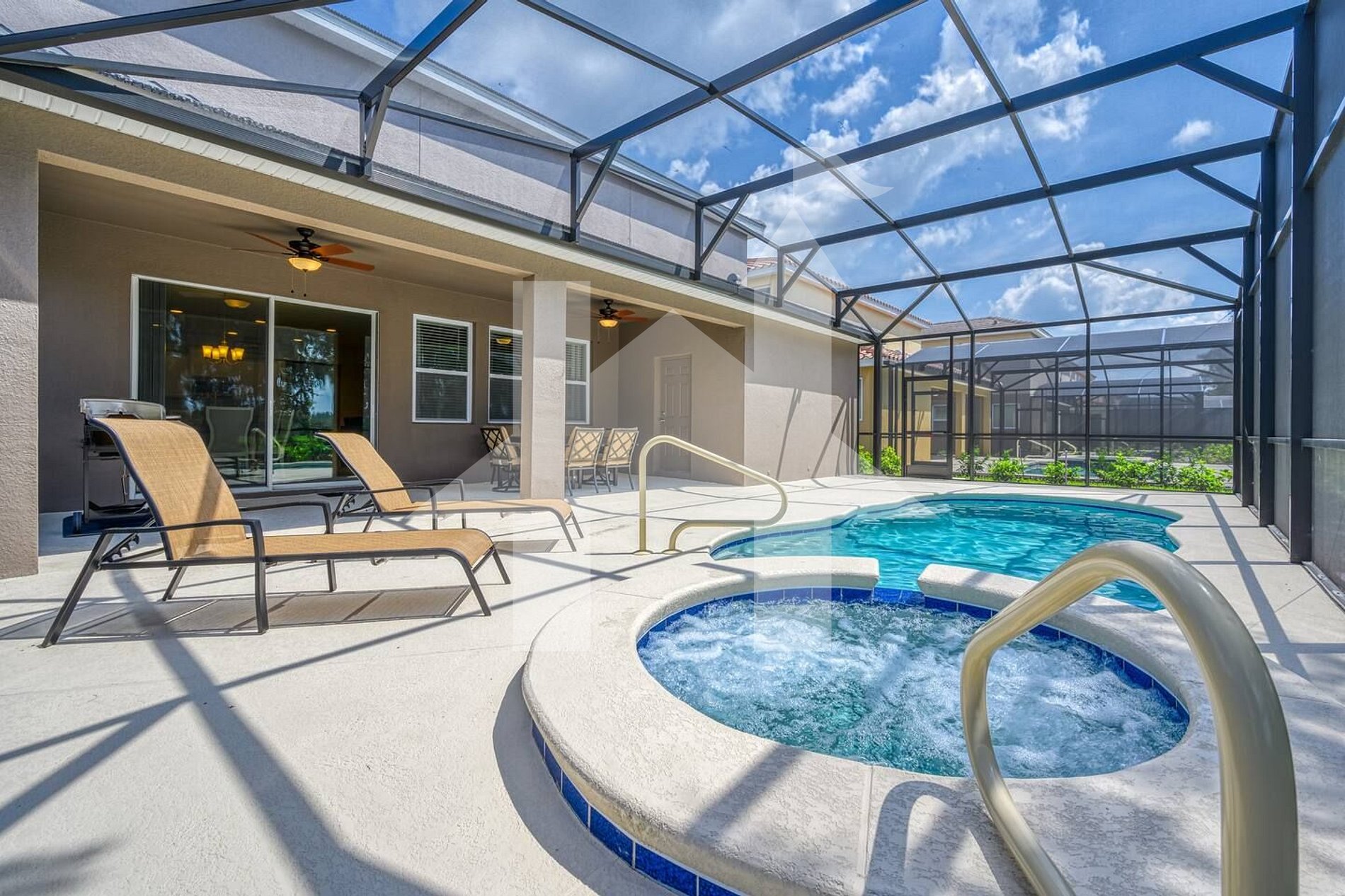 • Relax on the screened lanai with private pool, loungers, and outdoor dining. Pool heat is available for an additional fee with a 48‑hour notice.