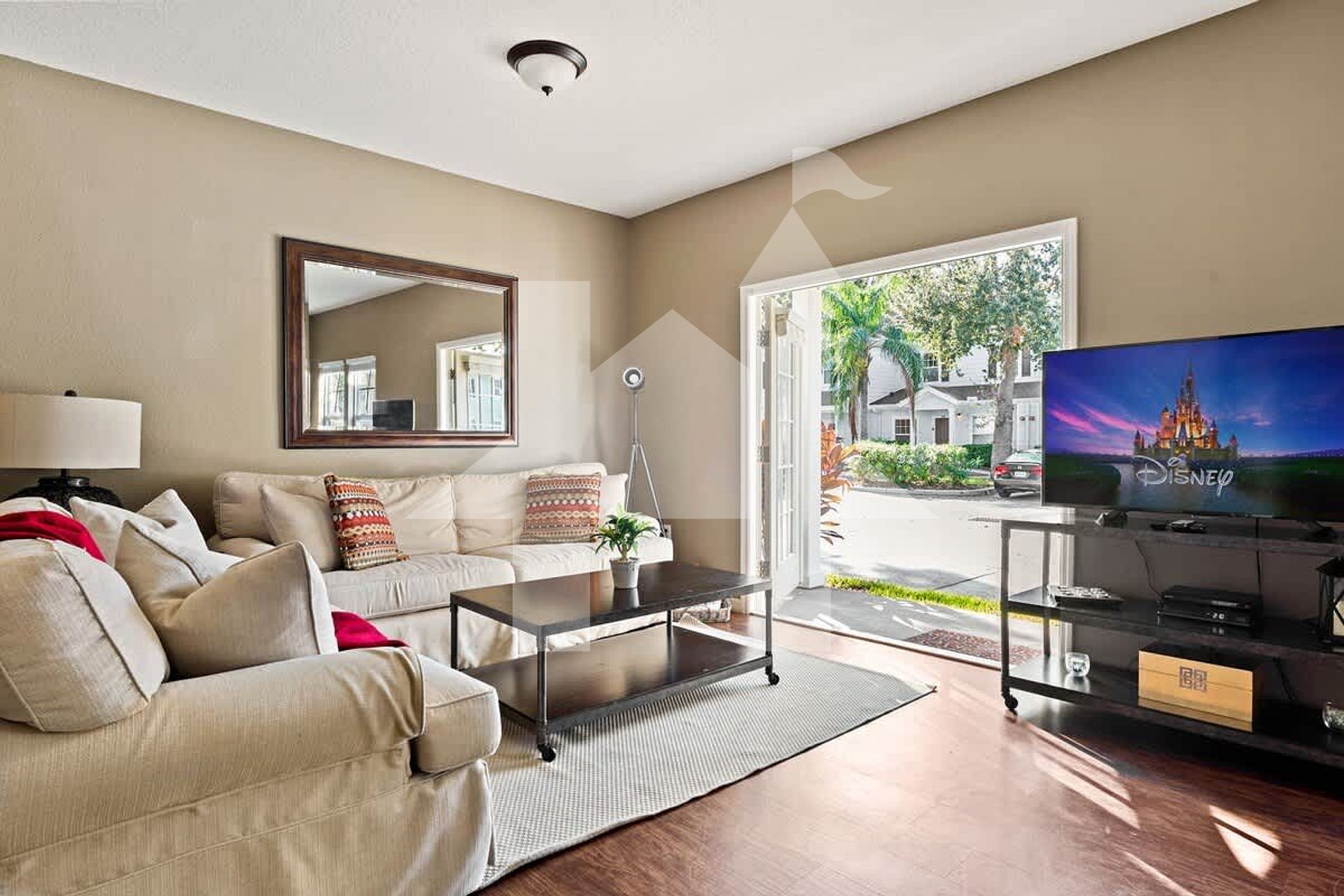Inside, the open floor plan includes a living room with a 50” TV, fully equipped kitchen, and connected dining and living spaces — ideal for family moments. High‑speed Wi‑Fi is available throughout, and every room features smart TVs for streaming services such as Disney+, Hulu, and ESPN+.