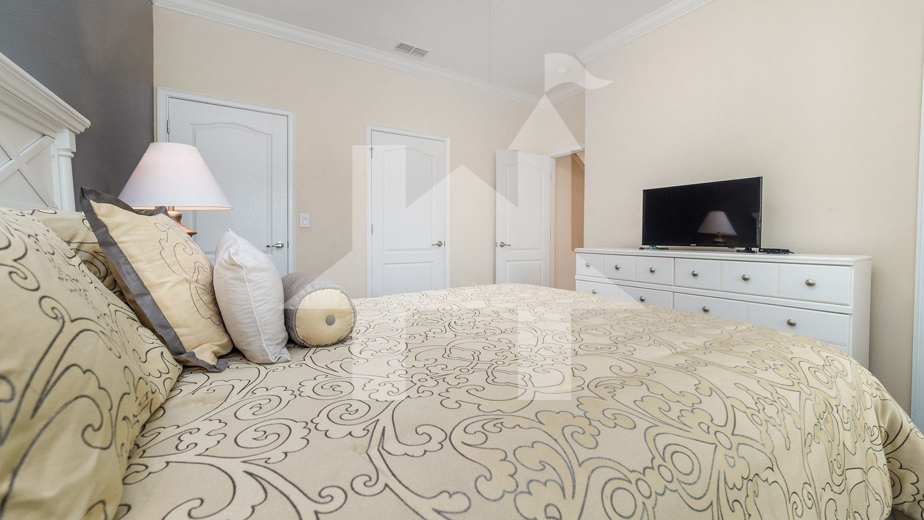Master Suite – Queen-size bed, SMART TV, closet, and private bathroom