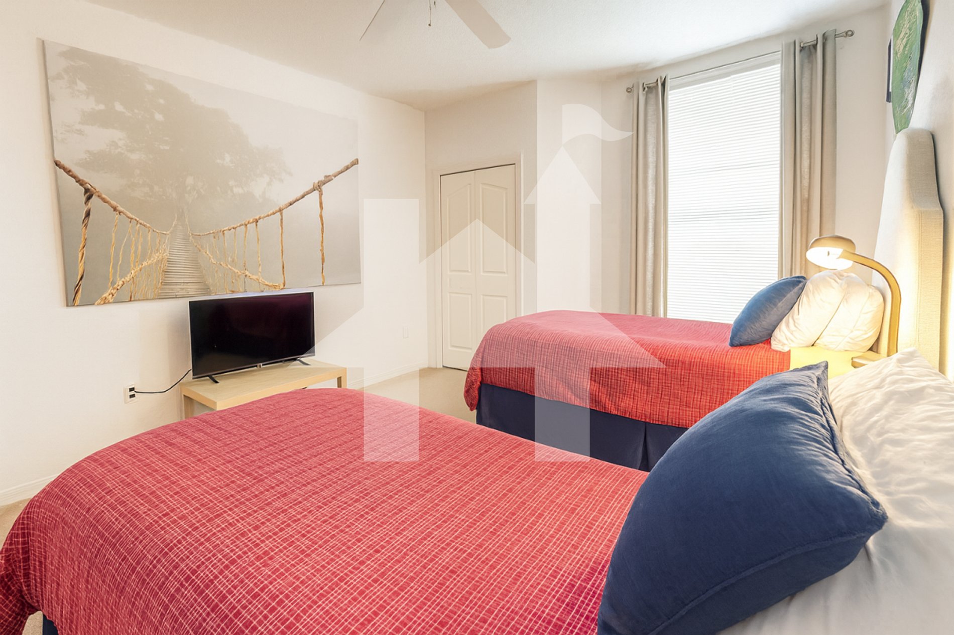 Bedroom 2: 2 twin beds, ceiling fan, Smart TV, spacious closet