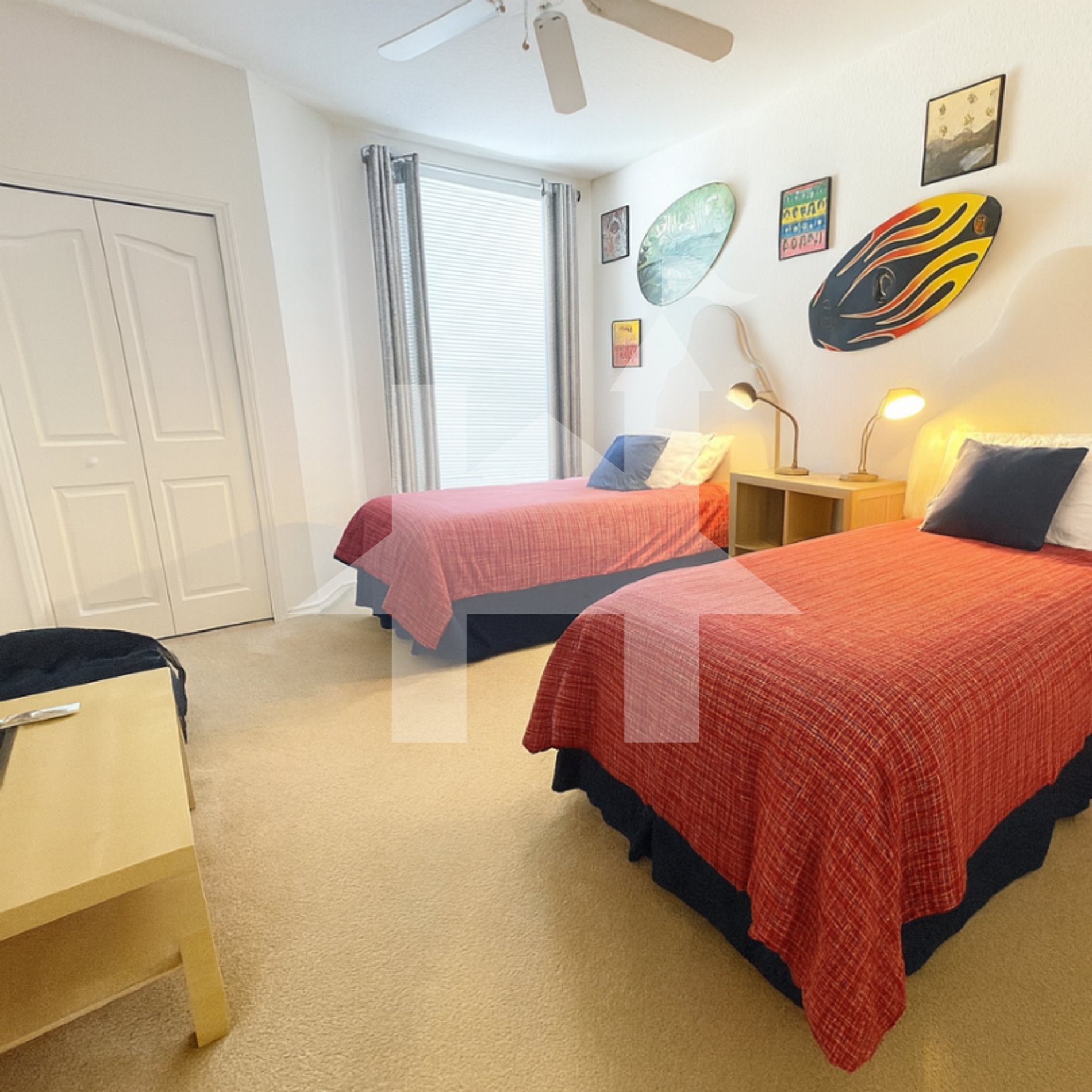 Bedroom 2: 2 twin beds, ceiling fan, Smart TV, spacious closet