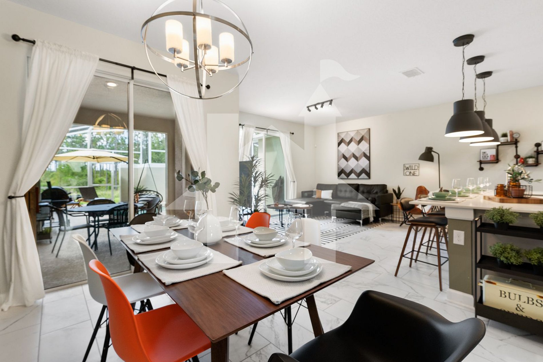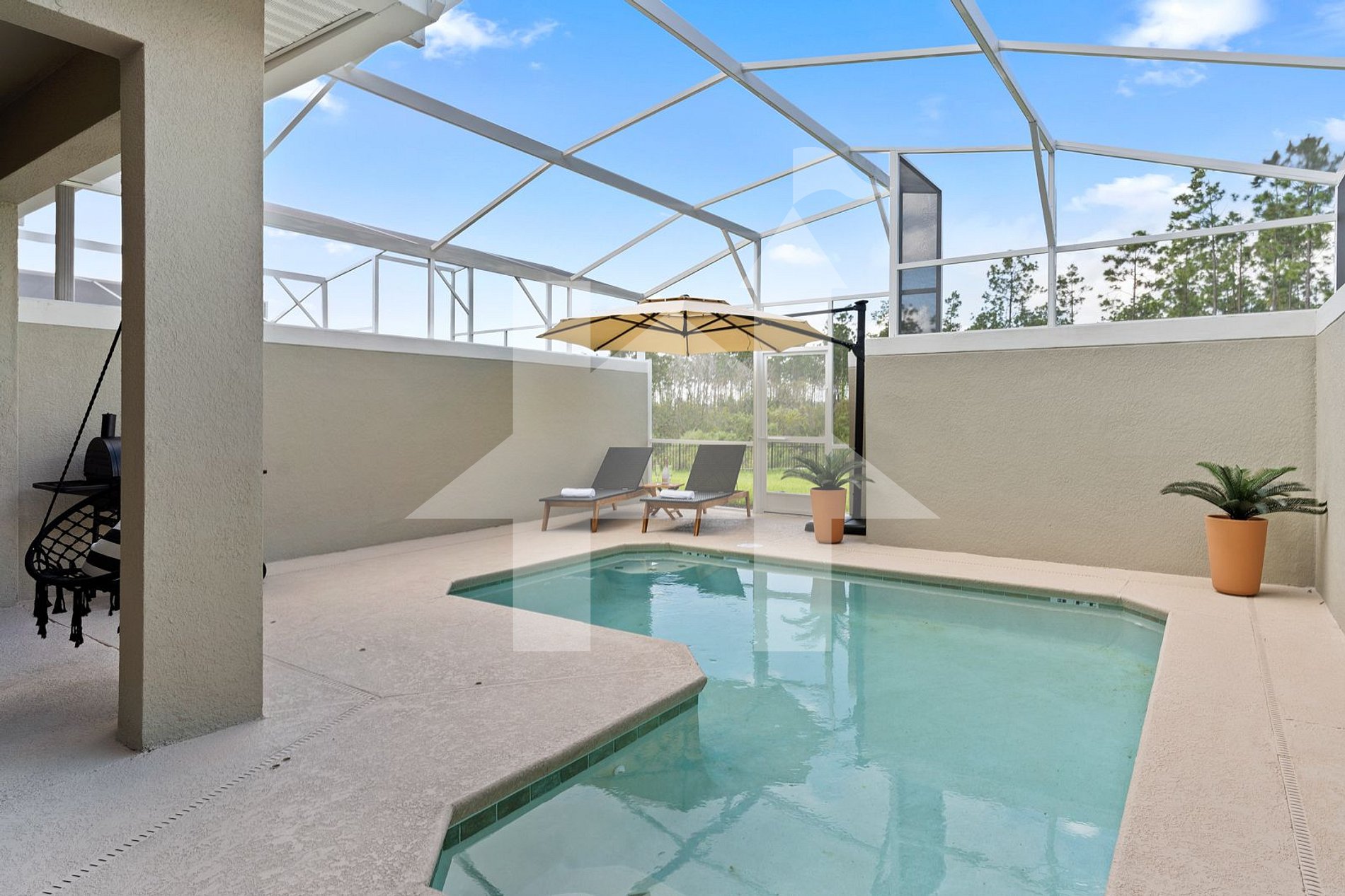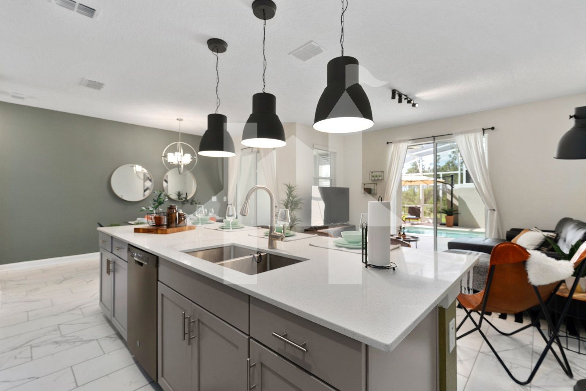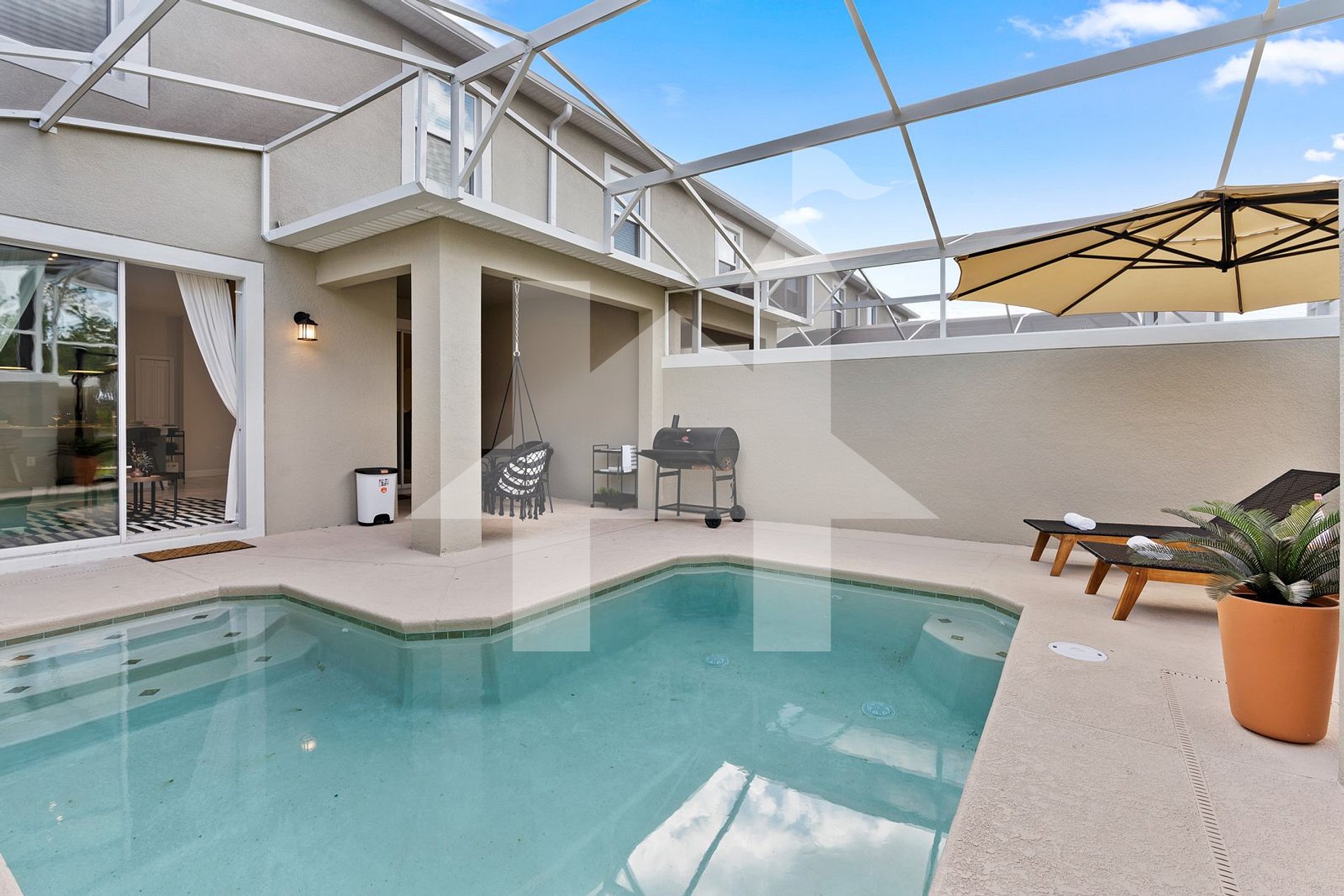 - Living Room: Spacious area with a comfortable sofa and a 65" 4K LED HDTV. View of the pool area through sliding glass doors.