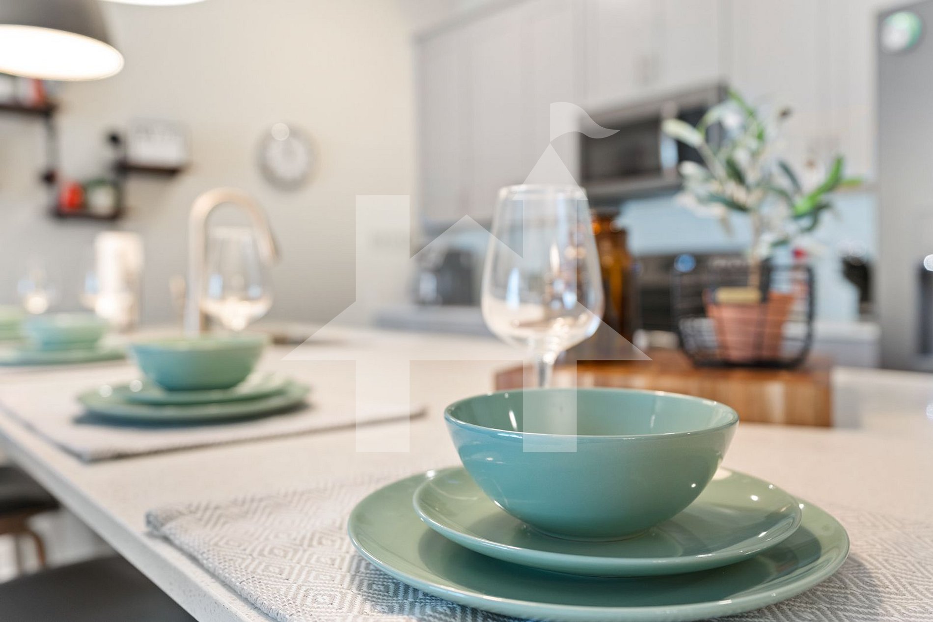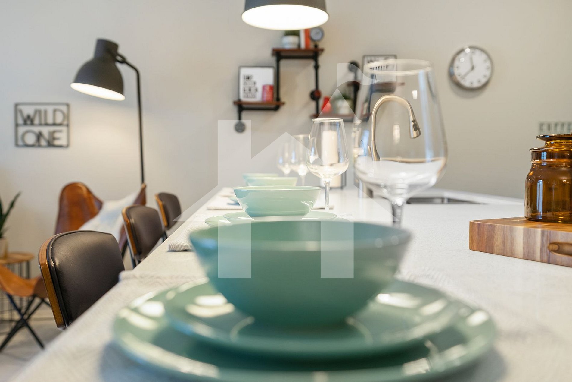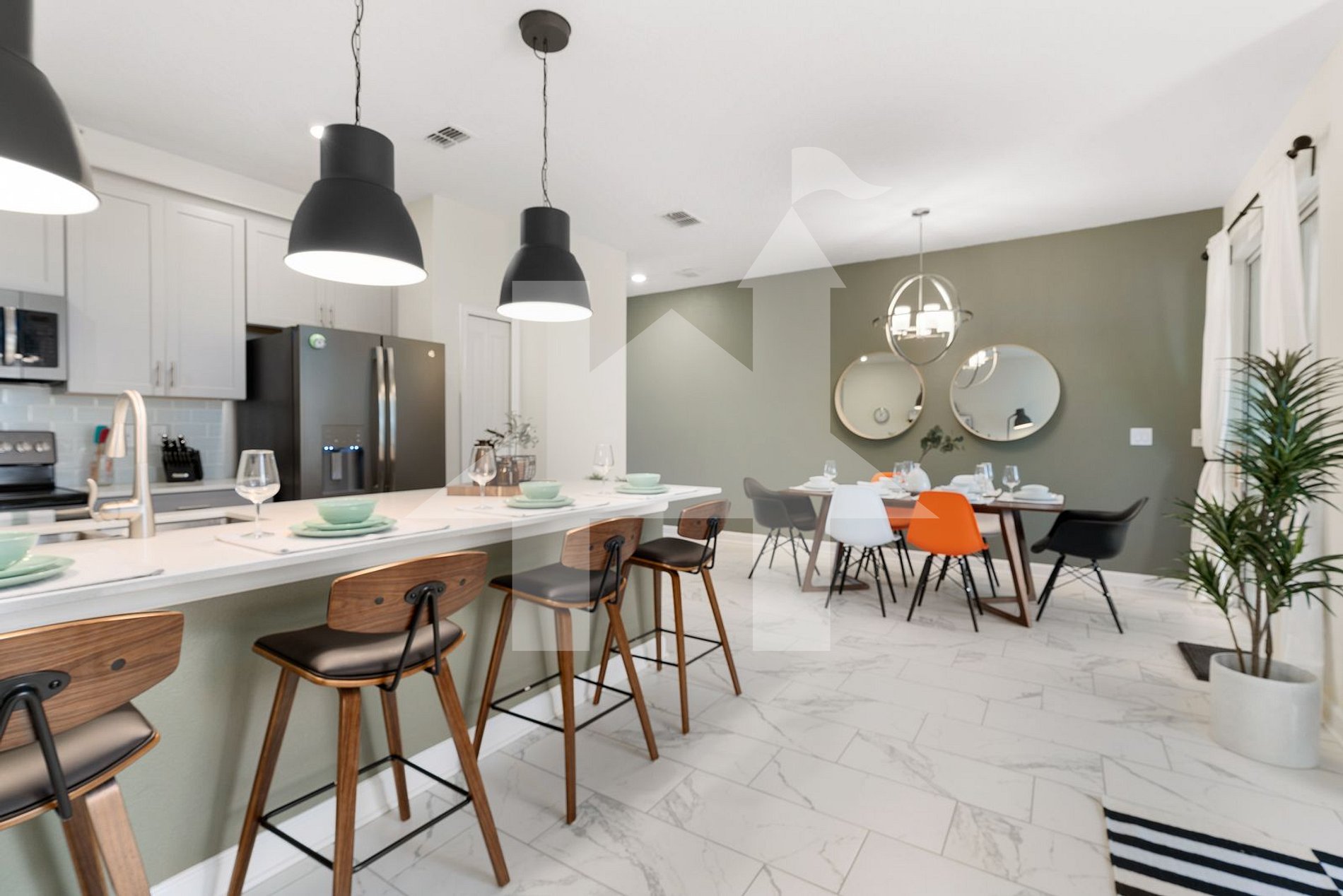 - Dining Room: Table for 6 people and a breakfast bar with 4 seats.