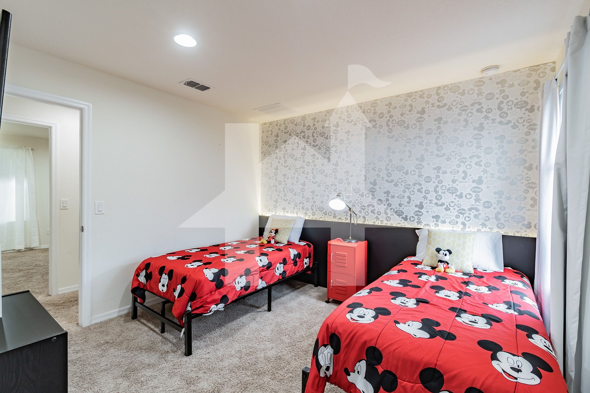 • Mickey-themed Suite with 2 twin beds, TV, closet, and private bathroom with shower