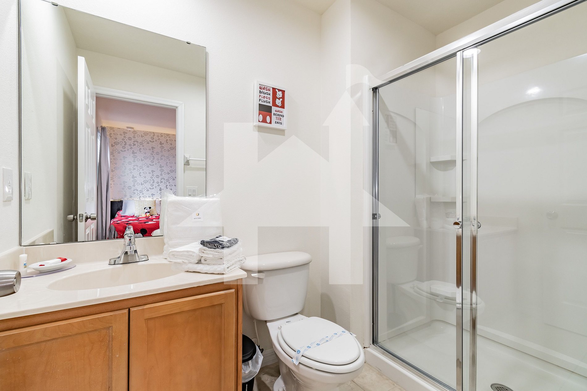 • Mickey-themed Suite with 2 twin beds, TV, closet, and private bathroom with shower