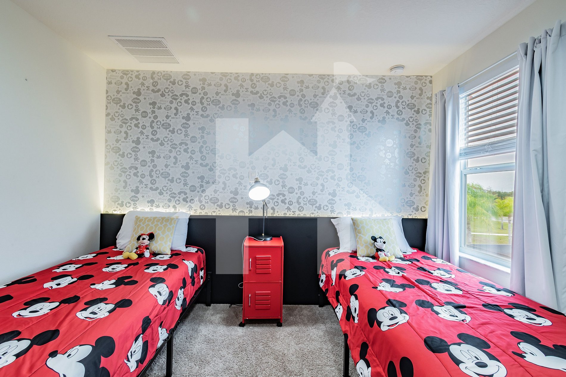 • Mickey-themed Suite with 2 twin beds, TV, closet, and private bathroom with shower