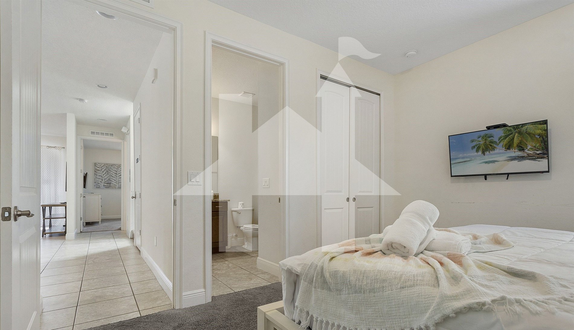 - Bedroom 2: King bed - Bathroom outside the room