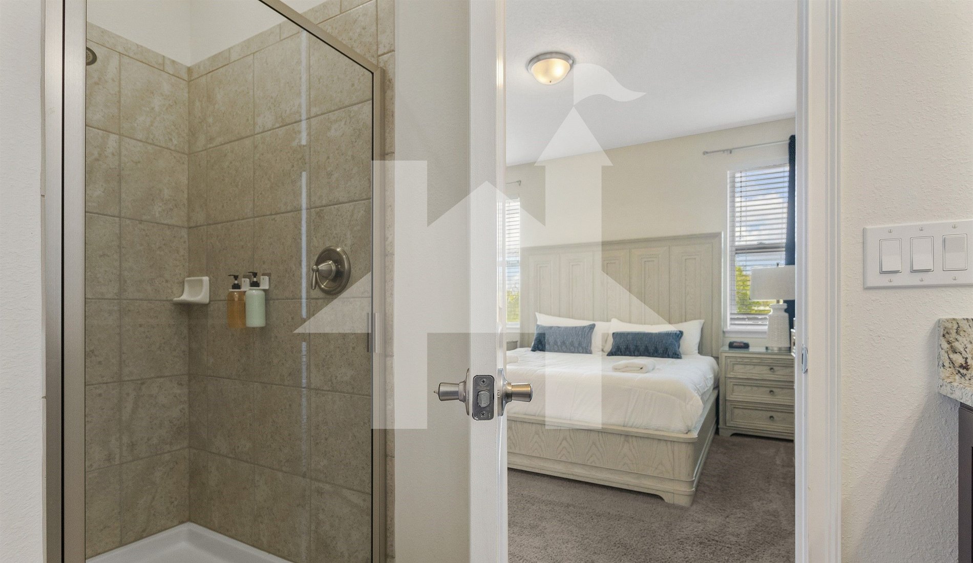 - Bedroom 2: King bed - Bathroom outside the room