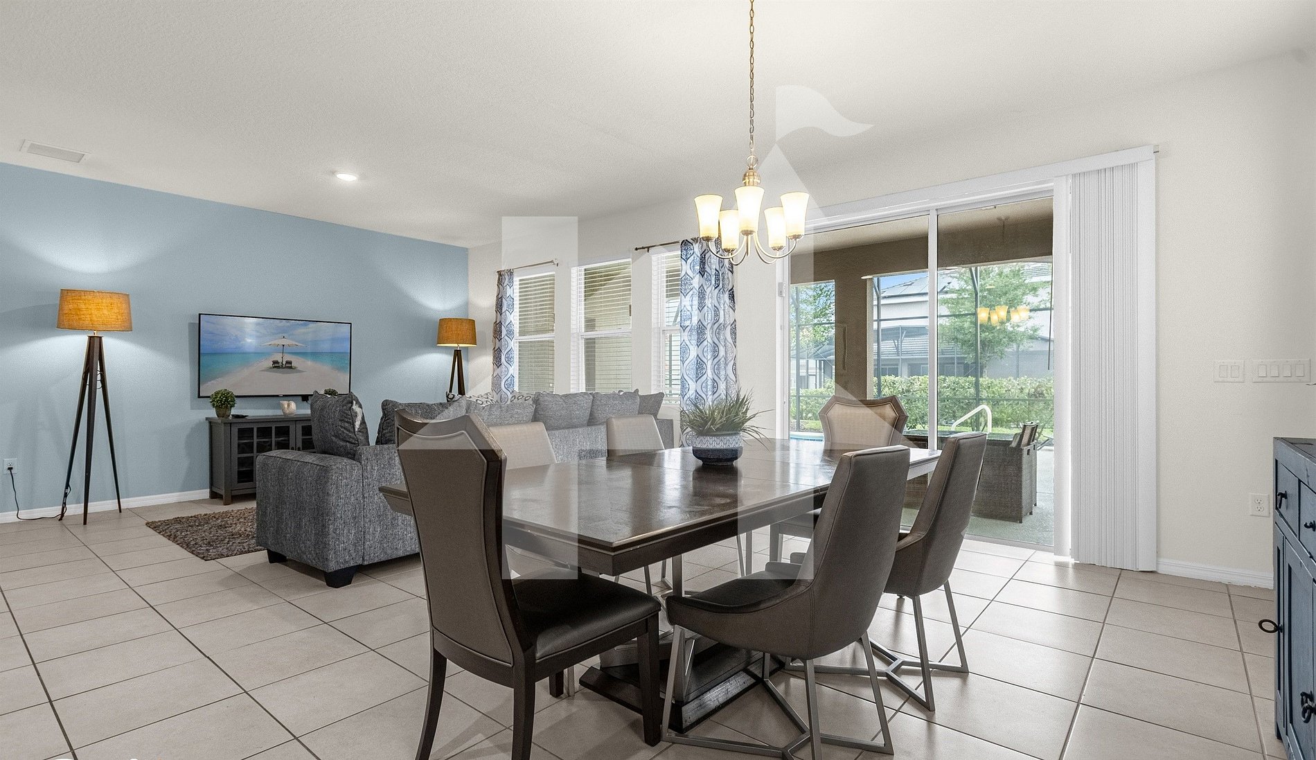 - Living room with sofa set, smart TV, and access to pool area