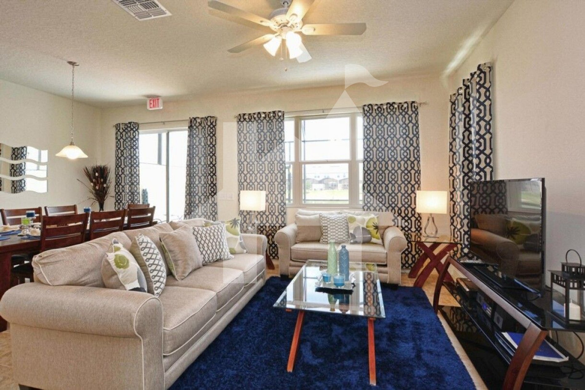 • Open-concept living room with cozy sofas and Smart TV