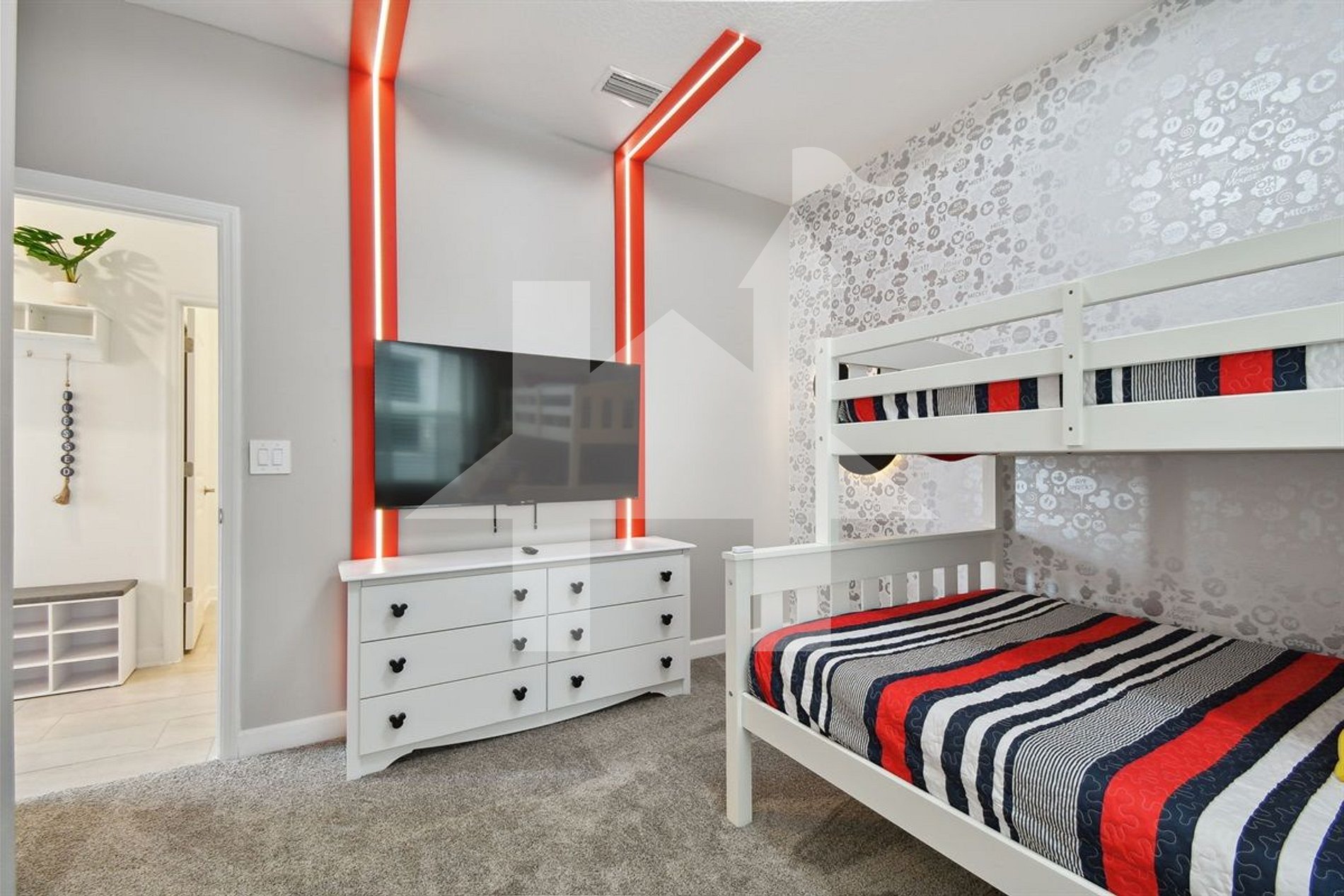 Bunk bed with twin over full + additional twin bed, SMART TV, and shared bathroom.