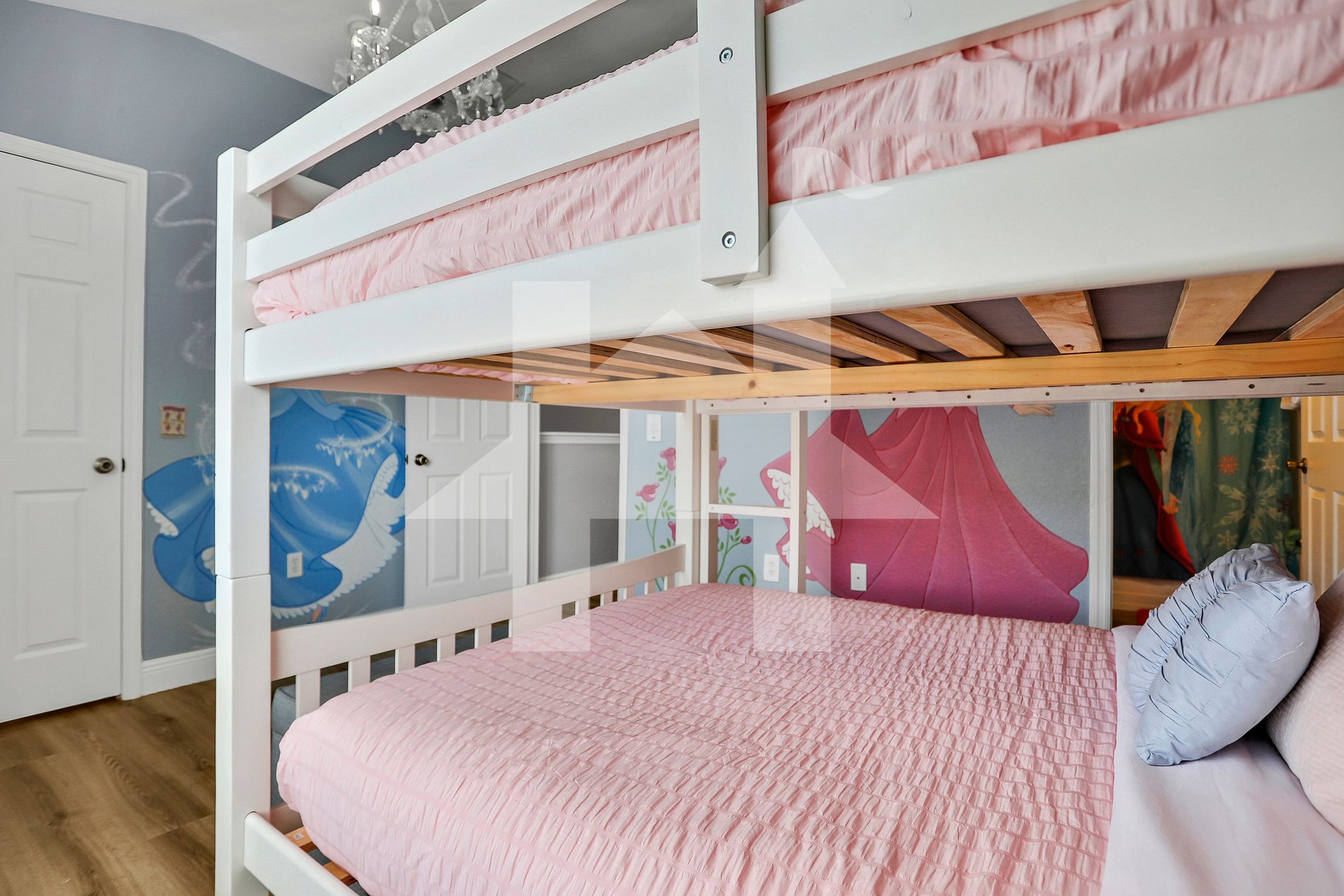 Master Suite with a king-size bed, walk-in closet, SMART TV, and private bathroom Princess-Themed Room with Full/Full bunk beds and SMART TV