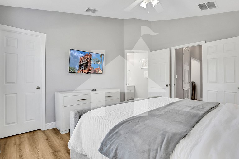 Master Suite with a king-size bed, walk-in closet, SMART TV, and private bathroom Princess-Themed Room with Full/Full bunk beds and SMART TV