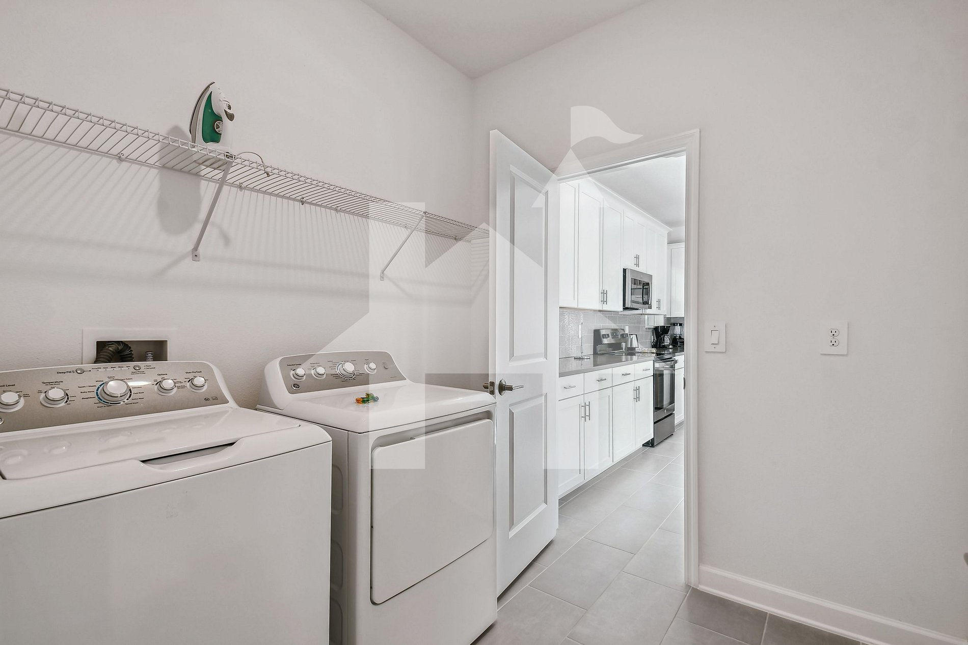 Laundry room with Washing Machine, Dryer, Iron, Iron table and clothesline.