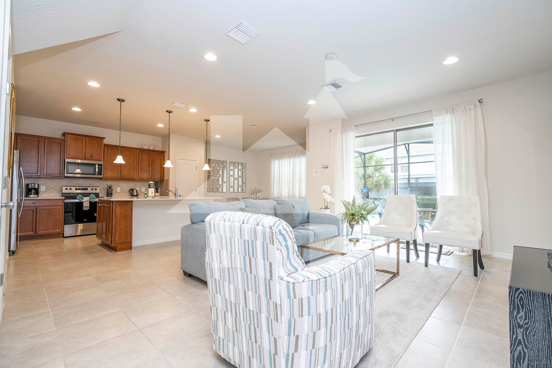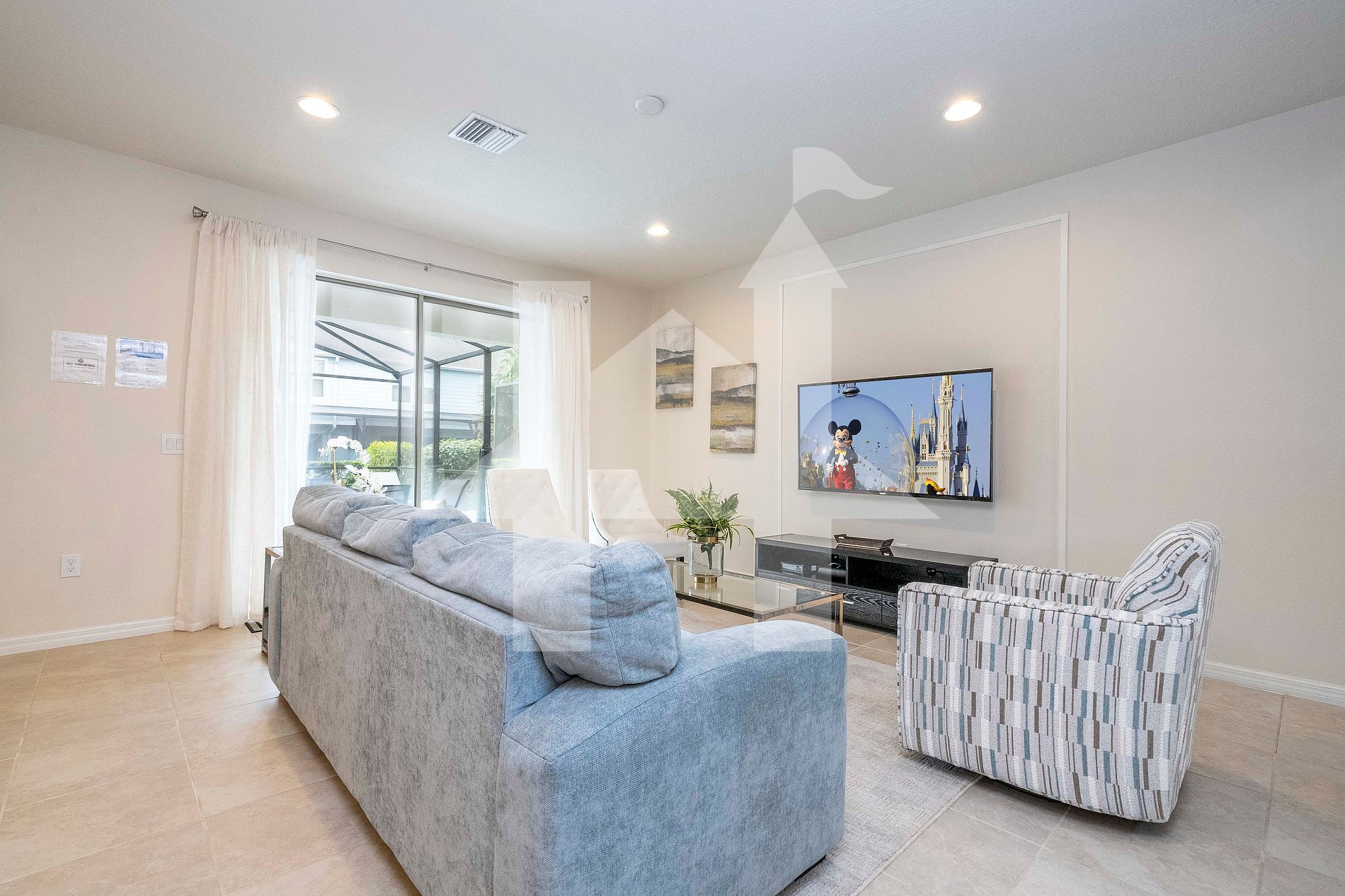 Living Room: Spacious, with cozy sofas and a SMART TV. This area opens to the patio and fully screened private pool.