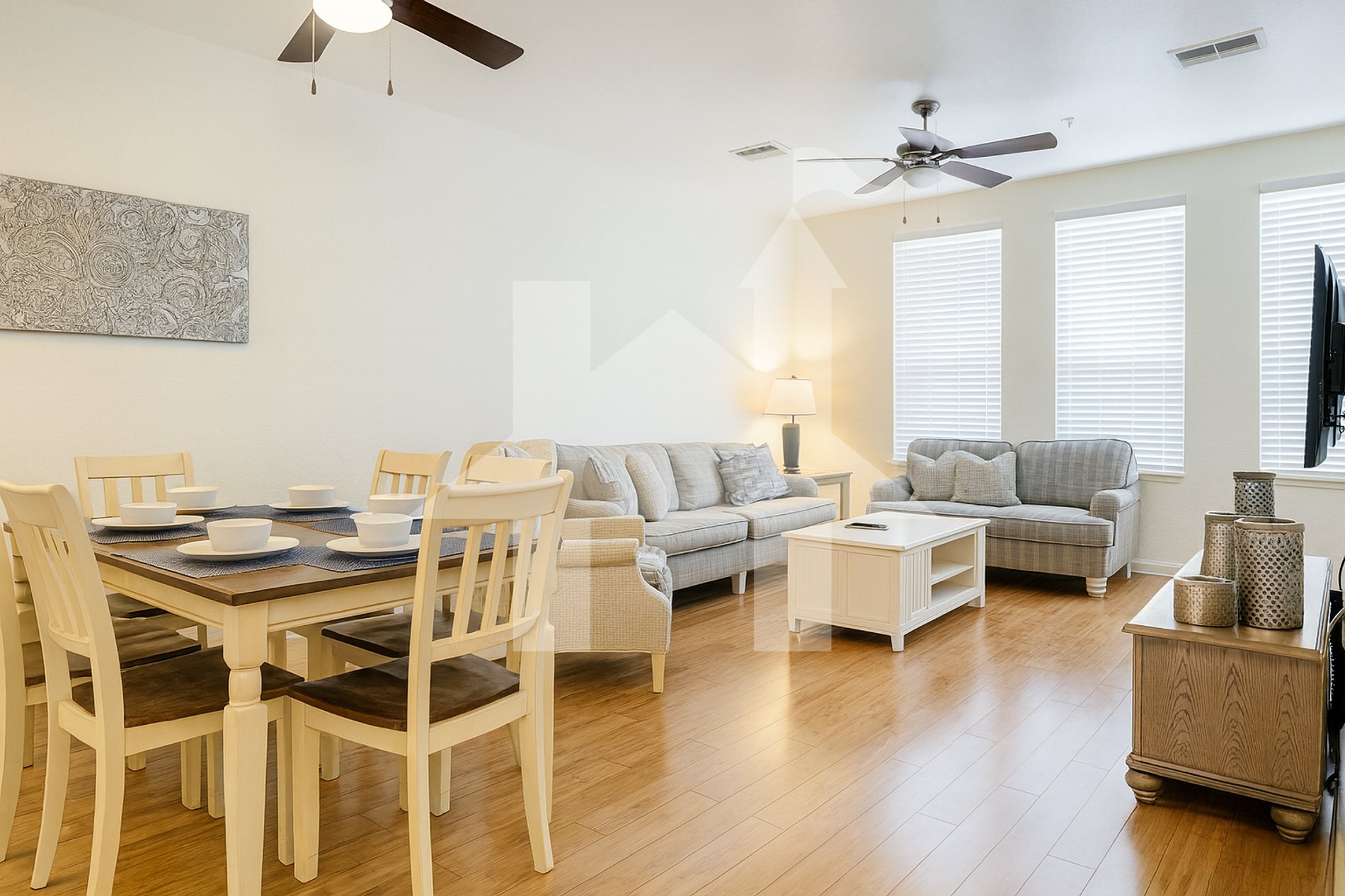 Stay in this Executive Three-Story Townhome and enjoy 1,800 square feet of space. The home offers the perfect layout to relax after a long day of sightseeing, with three spacious bedrooms, each with its own private bathroom. The second floor features a large living room with two sofas, an armchair, and a fully equipped kitchen, ideal for gathering family and friends.