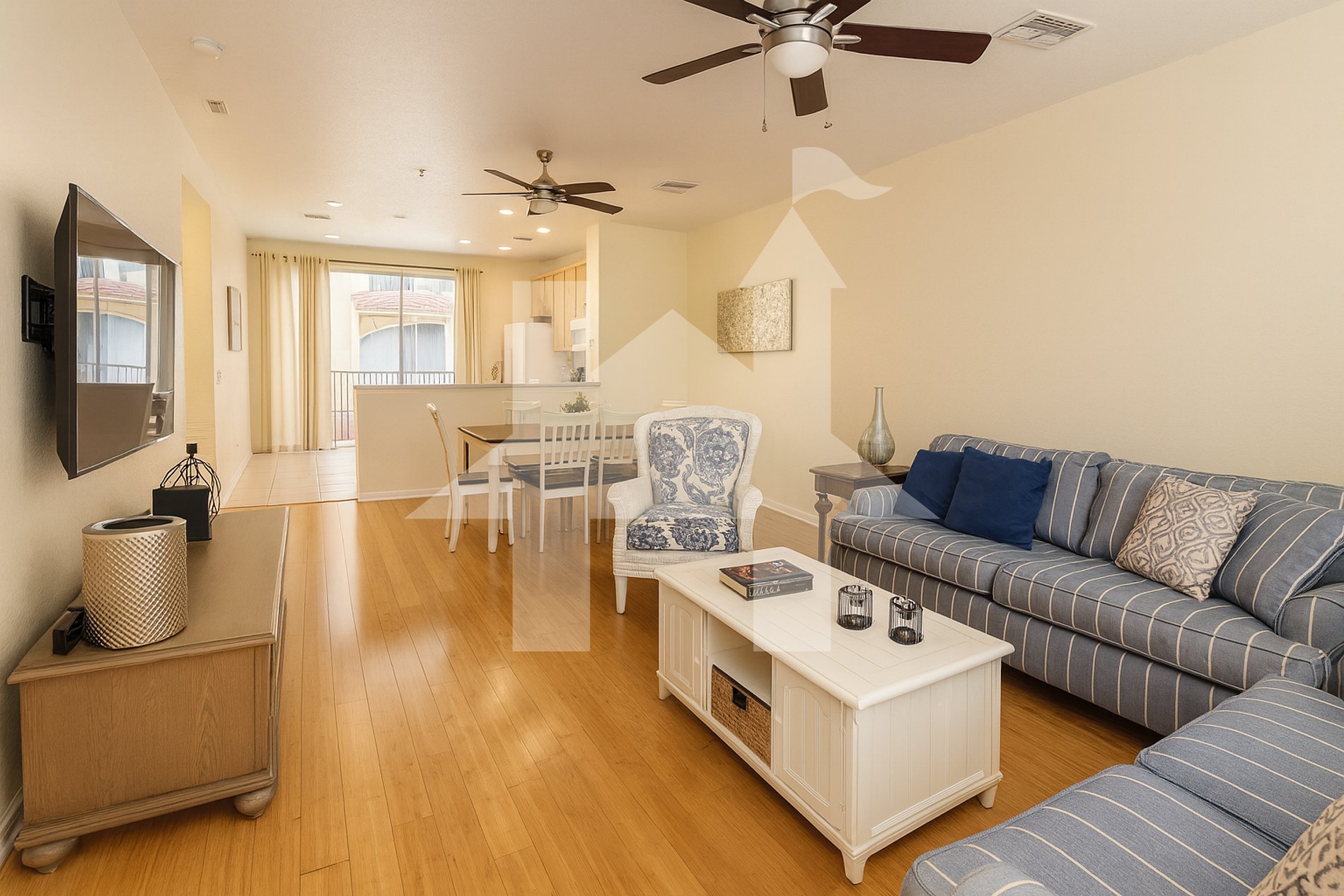 Stay in this Executive Three-Story Townhome and enjoy 1,800 square feet of space. The home offers the perfect layout to relax after a long day of sightseeing, with three spacious bedrooms, each with its own private bathroom. The second floor features a large living room with two sofas, an armchair, and a fully equipped kitchen, ideal for gathering family and friends.