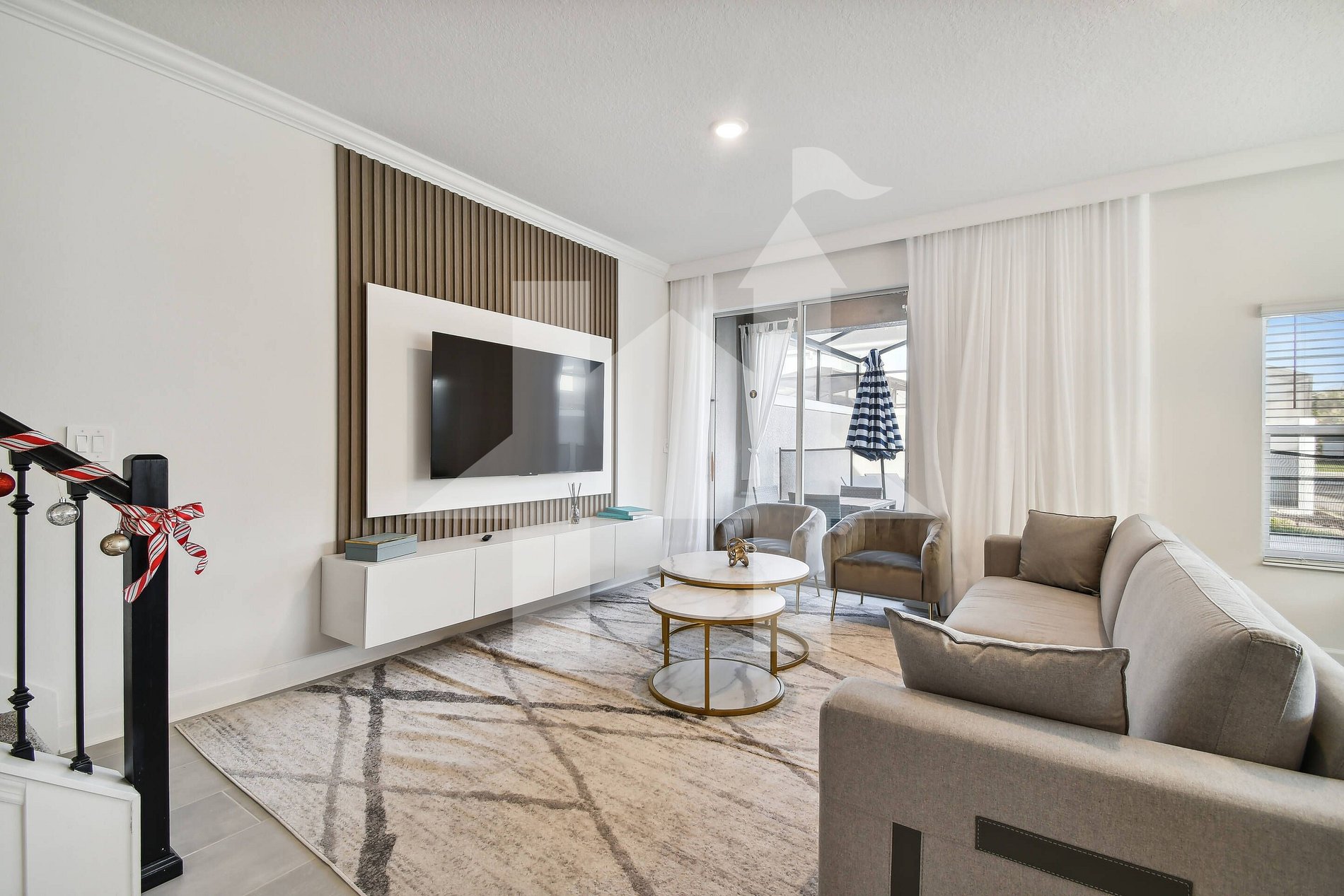 Living room with 6-seat sofa, loveseat, and 65″ Smart TV