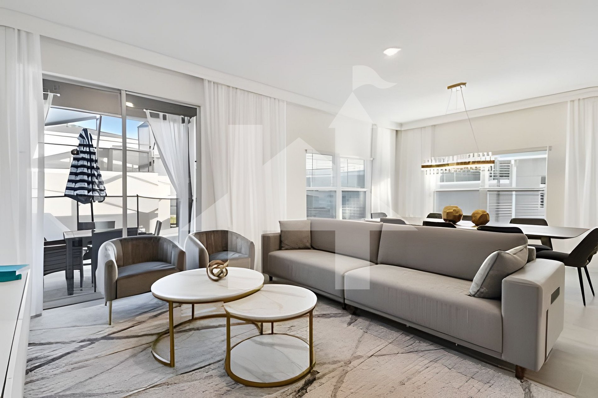 Living room with 6-seat sofa, loveseat, and 65″ Smart TV