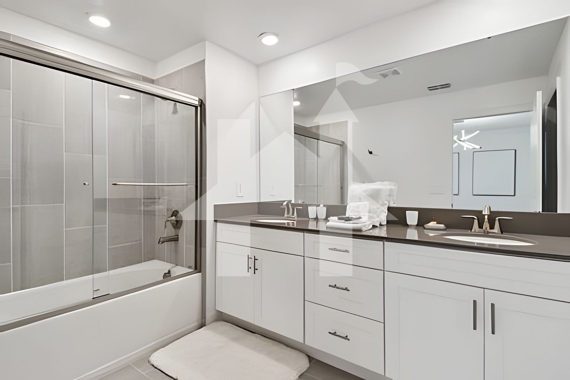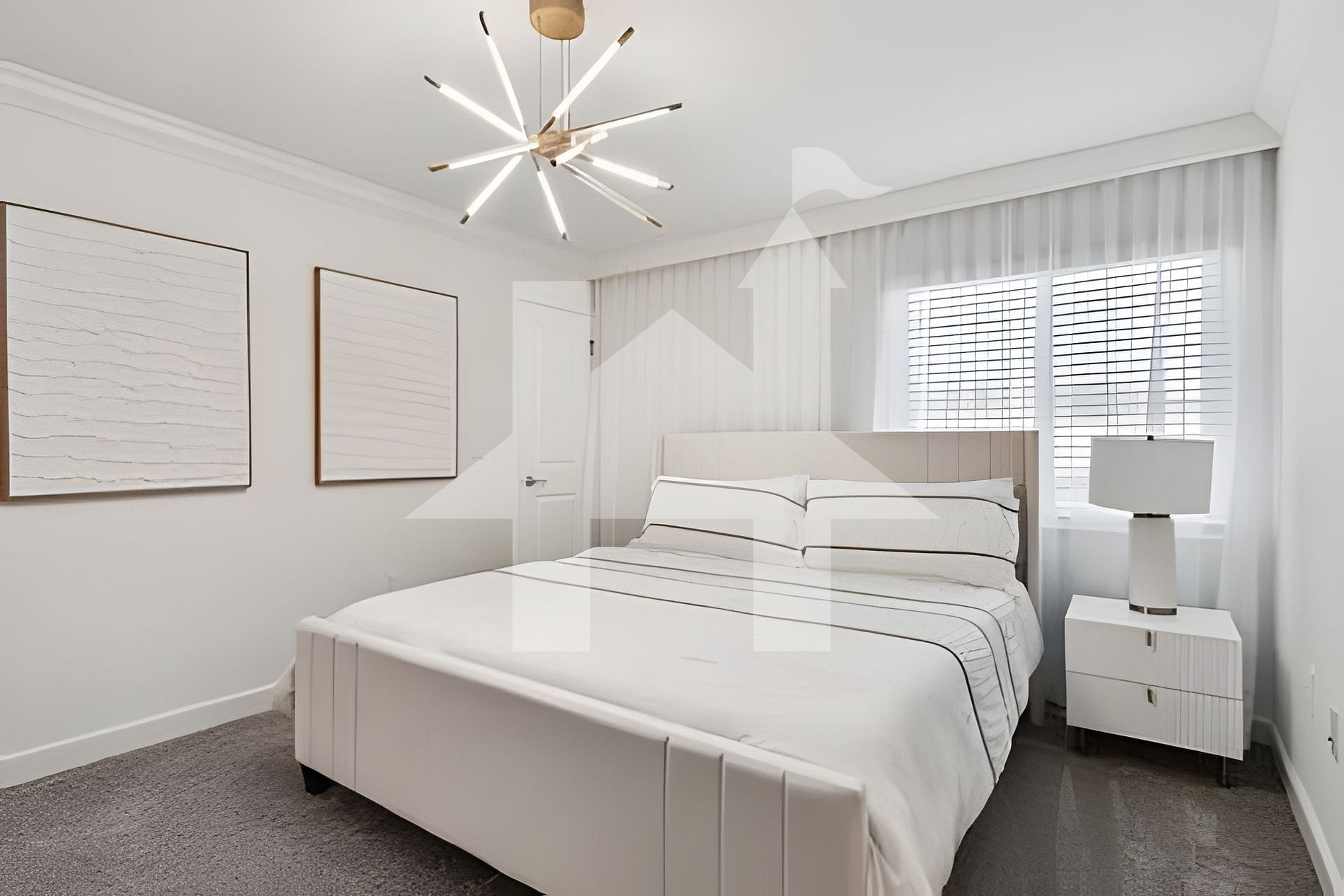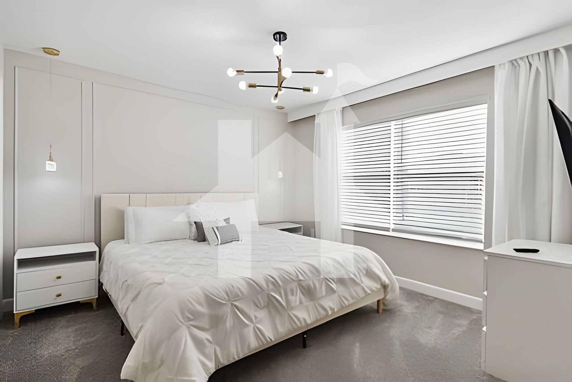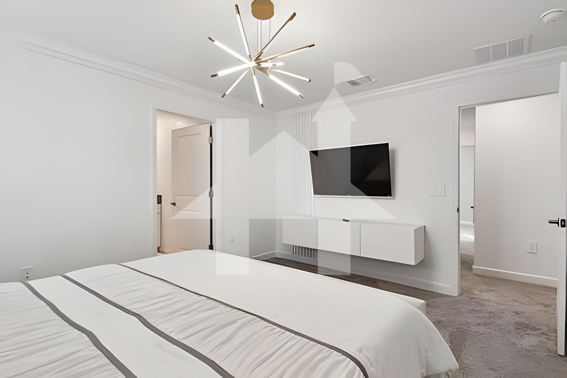 Bedroom 1: Queen bed + Smart TV, shared full bathroom