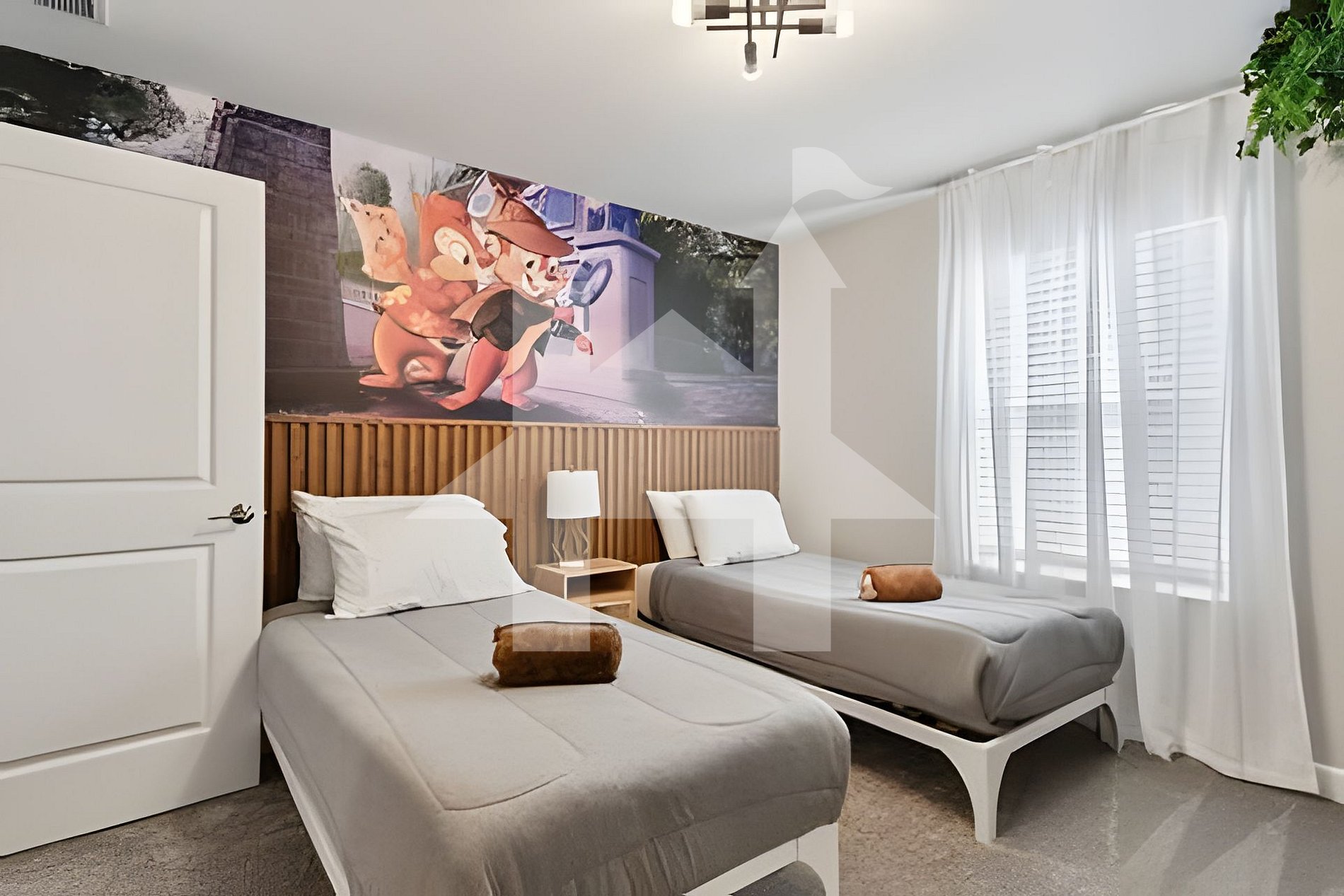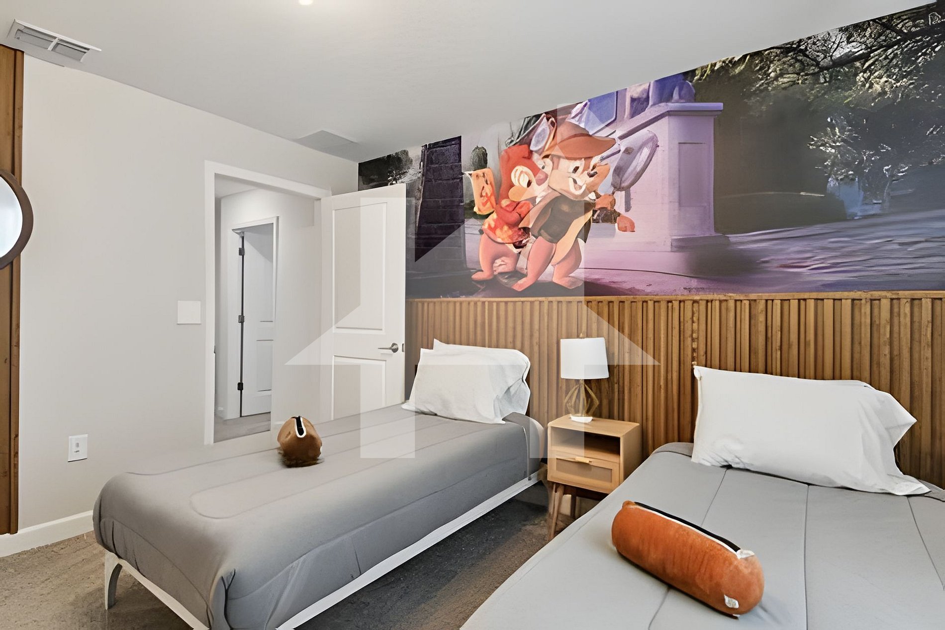 Bedroom 5 (Chip ‘n Dale Theme): 2 Twin beds, Smart TV, shared full bathroom