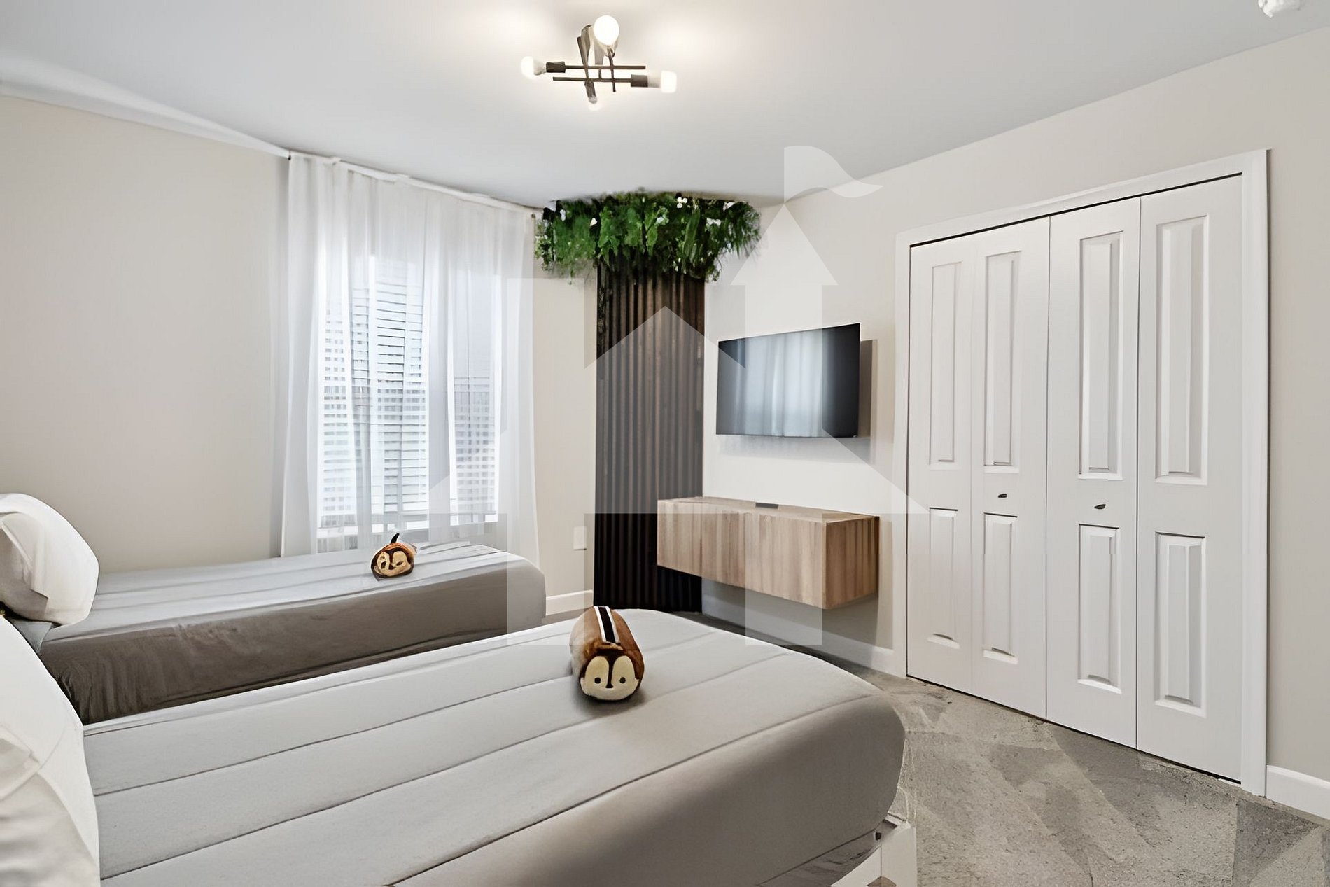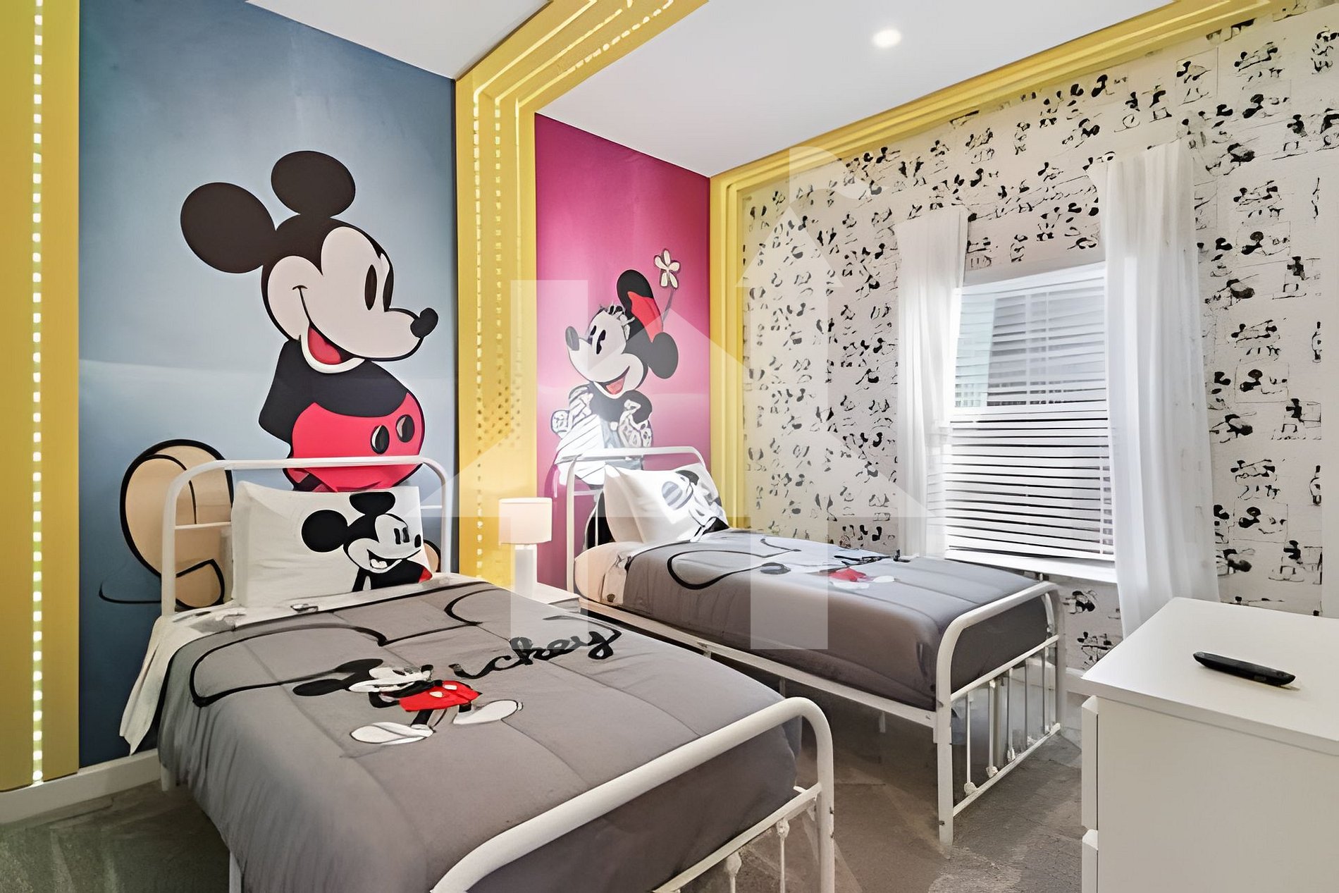 Bedroom 2 (Mickey Theme): 2 Twin beds + Smart TV, shared full bathroom