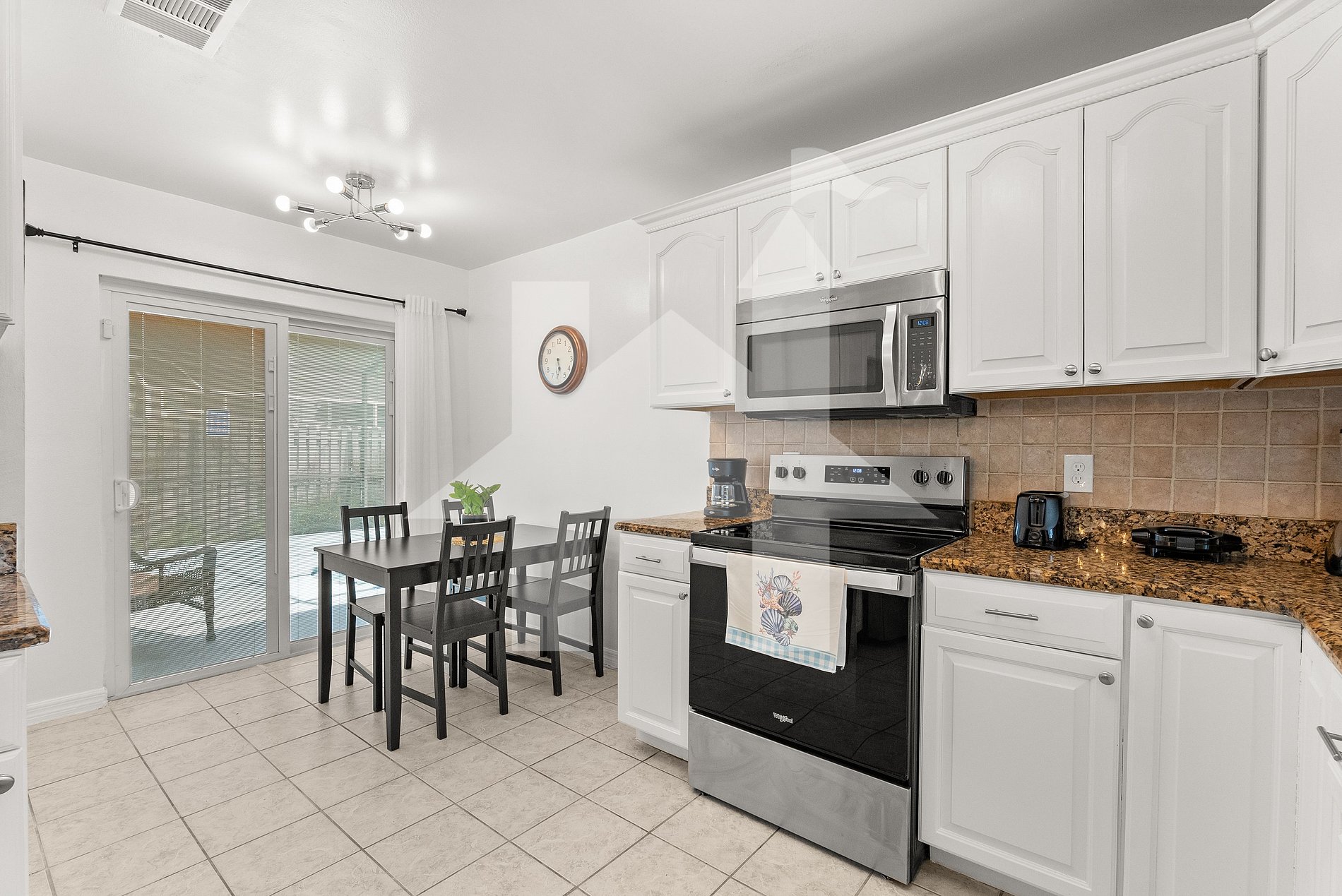 Prepare meals with ease in the fully equipped kitchen, featuring a fridge, microwave, stove, dishwasher, coffee maker, blender, toaster, waffle maker, and even a rice cooker. Kid-friendly plates and bowls included.