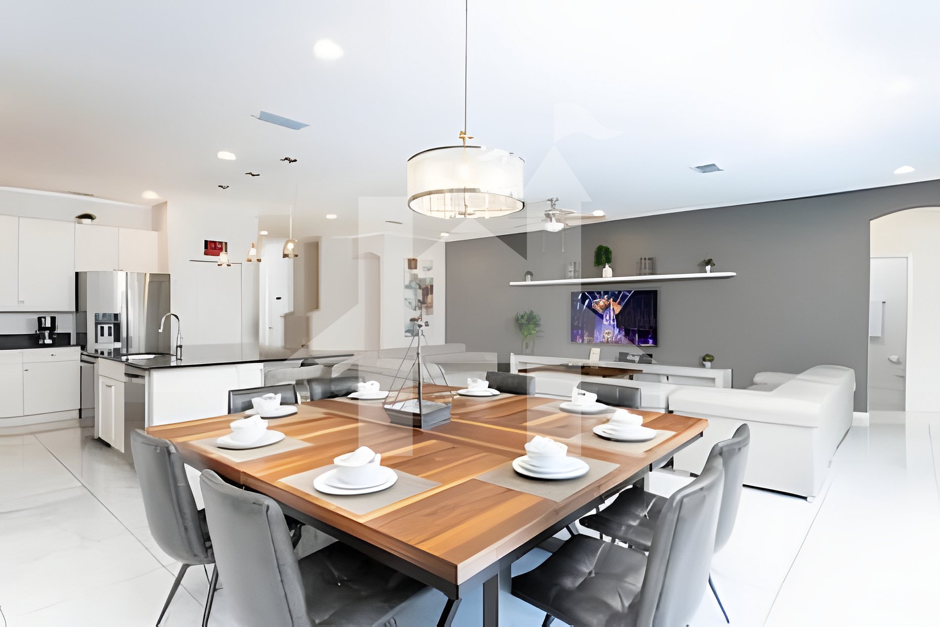 Open-concept living, dining, and kitchen with elegant designer furnishings.