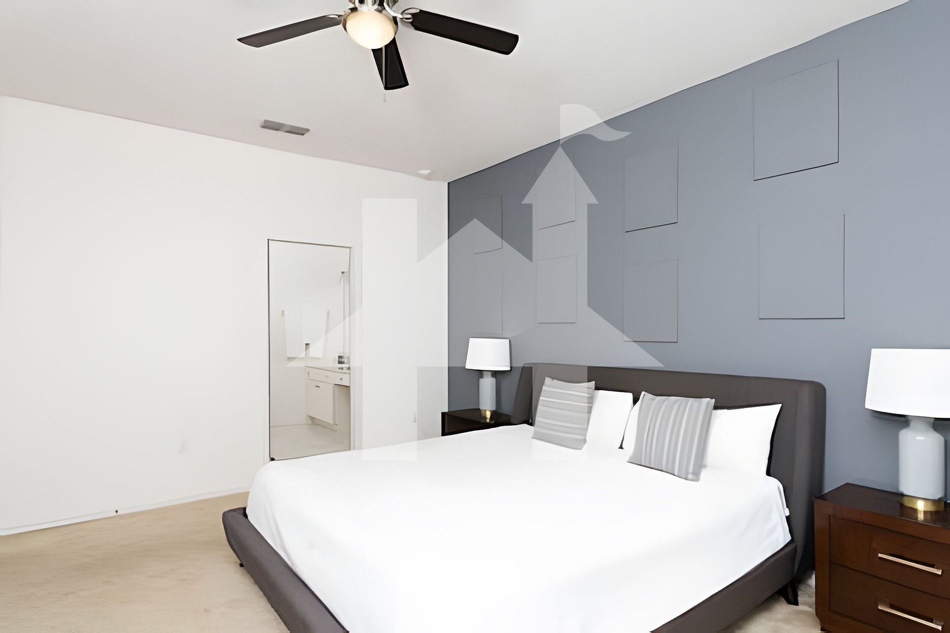 Bedroom 1 (First Floor): King bed, en-suite bathroom with walk-in shower & double sink, TV, ceiling fan.