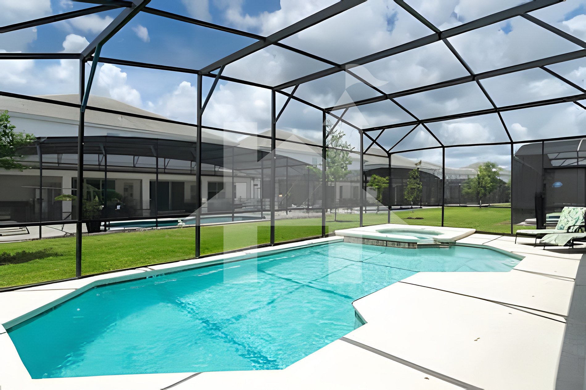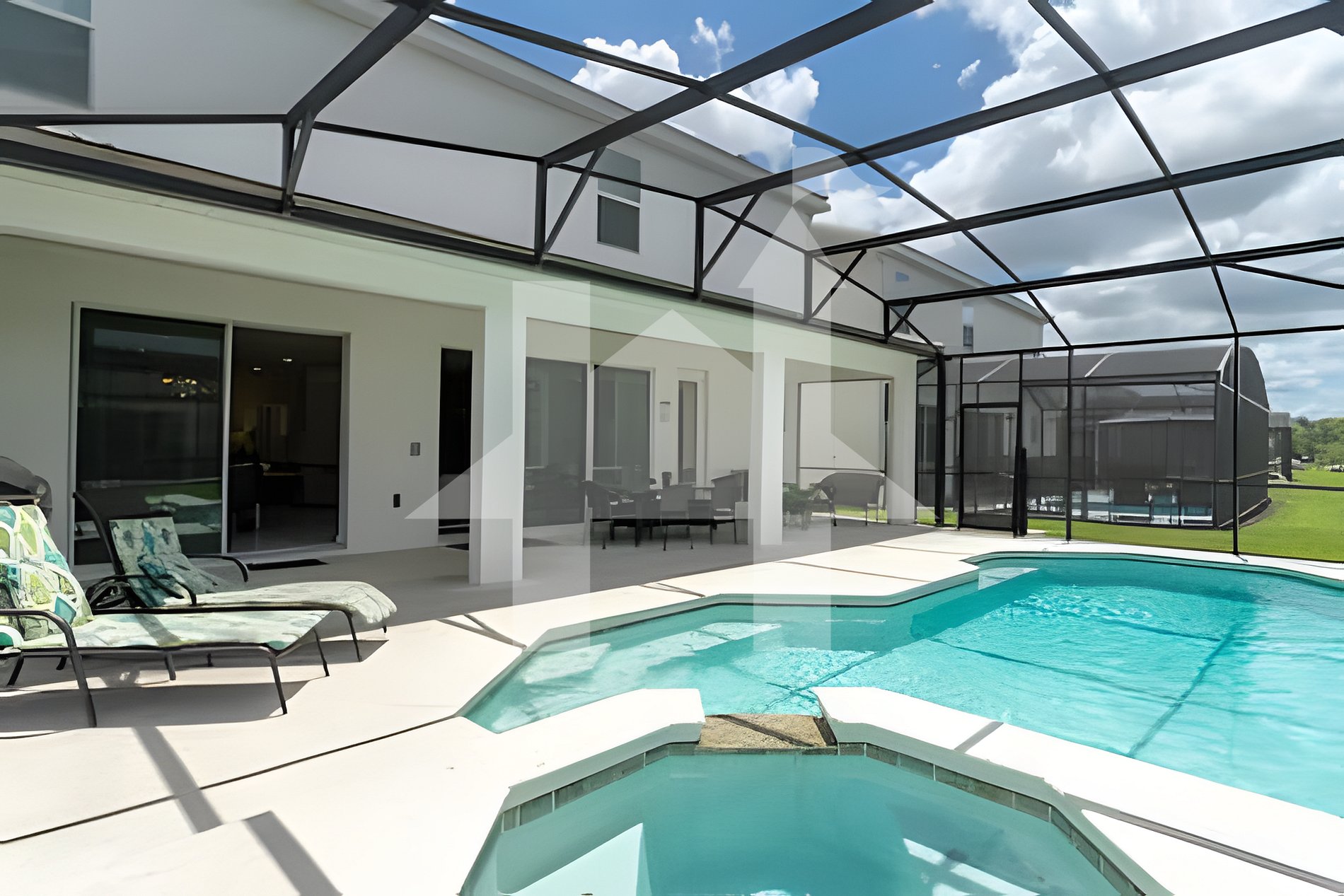 Beautiful private pool and spa with outdoor seating.